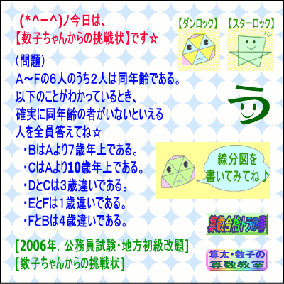 【数子ちゃんからの挑戦状2011】(公務員試験)*---------------------*【算数合格トラの巻】【算太・数子の算数教室】(R)*---------------------*(o^-')b 本日はこの問題にチャレンジ☆【数子ちゃんからの挑戦状2011】(公務員試験)です☆ *---------------------*(*^ー^)ノこんにちは☆数子ちゃんです♪私から、小学生でも解ける『公務員試験問題』を出題いたしますね!【数子ちゃんからの挑戦状】です☆ (問題)A~Fの6人のうち2人は同年齢である。以下のことがわかっているとき、確実に同年齢の者がいないといえる人を全員答えてね☆ ・BはAより7歳年上である。・CはAより10歳年上である。・DとCは3歳違いである。・EとFは1歳違いである。・FとBは4歳違いである。 [2006年.公務員試験・地方初級改題][数子ちゃんからの挑戦状] *---------------------* (*^ー^)ノ新コーナー☆【数子ちゃんからの挑戦状】です!数子ちゃんの出題問題は、公務員試験でも「推理算」のようですね!君は数子ちゃんの挑戦に勝てるかな?(^o^)/ 【ダンロック】君がヒントを言ってますように、「線分図」などを書いて、整理してみましょう! さらにヒントです! ↓ ↓ ↓ ↓ ↓ ↓ ↓ ヒントは「該当者は2人です」 う山先生の予想正答率は、40%以下 です。 ではレッツ・ゴー!! 答えは、[AとF]です。 *---------------------*中学受験・受験算数算数・プロ家庭教師・算数個人指導*---------------------*□□□□□□□□□□□□[発行者氏名] 【う山雄一】[発行者web] 【算数合格トラの巻】[著作]【算太・数子の算数教室】(R)[著作]【算遊記】[仕事URL]http://www2.to/sansuhttp://www.alpha-net.ne.jp/users2/popopo/[仕事用メール] sansu_gokaku@hotmail.com[ブログ] 【算数合格トラの巻】 [ブログ] 【算太・数子の算数教室】(R)□□□□□□□□□□□□ ☆