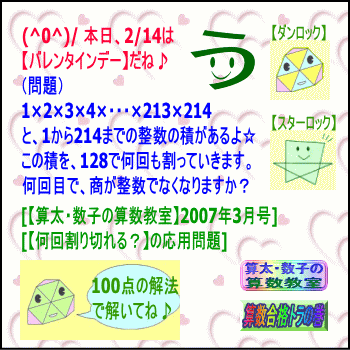 [算数合格]【算太・数子】(数の性質)[何回割れる?]*---------------------*【算数合格トラの巻】【算太・数子の算数教室】(R)*---------------------*(o^-')b 本日はこの問題にチャレンジ☆2007年3月号に書きました、[何回割れる?]の決定版の応用問題です♪ *---------------------* (^0^)/ 本日、2/14は【バレンタインデー】だね♪ですので、[214]に関連した問題を!(問題) 1×2×3×4×・・・×213×214 と、1から214までの整数の積があるよ☆この積を、128で何回も割っていきます。何回目で、商が整数でなくなりますか? [【算太・数子の算数教室】2007年3月号][【何回割り切れる?】の応用問題] *---------------------* (*^ー^)ノよくある問題ですね!ちょこっと難しく出題しました☆ 先週、このパターンを勉強した塾もあるようですね。その解答を見てみますと、う山先生が、2007年3月号に執筆した解法そのままですね♪ そうです!大手塾も、【算太数子】に書きました解法を「一番良い解法」と認めてるようです☆ 【算太・数子の算数教室】のバックナンバー、---------------------------------『算太・数子の算数教室』(通算96号)2007年03月発行(vol.26)数と仲良しになろう☆【0連続】【何回割り切れる?】塾の授業レベル・家庭教師のレベルもこれでわかっちゃいますよ~---------------------------------に、その決定版を詳しく書きました☆ その中に、『60点の解法・80点の解法・90点の解法・100点の解法』とか、、 『塾の算数の授業レベルや家庭教師のレベルを見ることができる』とか、書きましたので、2007年3月以降、う山先生が示した『100点の解法』で指導する塾がほとんどになったようです☆(^o^)/ テキストの解法は、昔の80点の解法なのに、「塾の先生の解き方は、う山先生と同じでした~」と毎年、生徒から聞きます♪ 【算太・数子の算数教室】(R) や、【算数合格トラの巻・メルマガ】は、受験生のご父兄よりも、算数の指導者に『隠れた絶大な人気』があるのかもです!? 制限時間は、3分以内です。解き方にまだ慣れてない受験生は、思考が迷路に入ってしまうかもしれませんが、10分くらいは悩んでみましょう! う山先生の予想正答率は、この時期ですと、10%以下です。 ではレッツ・ゴー!!☆(^o^)/ 答えは、本日中(2011-02-14)に解答専用メールにご連絡あった方に解答を送信致します☆解けなくても、「解答希望」でOKです☆ [解答専用メール]sansu_gokaku@hotmail.co.jp 答えは、[●●●]です *---------------------*中学受験・受験算数算数・プロ家庭教師・算数個人指導*---------------------*□□□□□□□□□□□□[発行者氏名] 【う山雄一】[発行者web] 【算数合格トラの巻】[著作]【算太・数子の算数教室】(R)[著作]【算遊記】[仕事URL]http://www2.to/sansuhttp://www.alpha-net.ne.jp/users2/popopo/[仕事用メール] sansu_gokaku@hotmail.com[ブログ] 【算数合格トラの巻】 [ブログ] 【算太・数子の算数教室】(R)□□□□□□□□□□□□ ☆