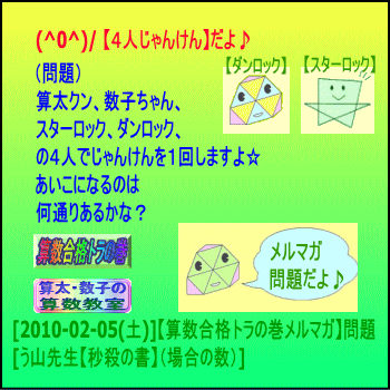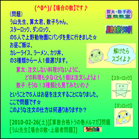 [算数]【算数合格トラの巻・メルマガ 2011-02-26】(予告)*---------------------*【算数合格トラの巻】【算太・数子の算数教室】(R)*---------------------*(o^-')b 本日、昼12時に、メルマガ発送予約をしました☆ *---------------------*(*^ー^)ノ今回のメルマガは、【場合の数】の応用問題です☆ 今回も、念のためGIFの図もブログに貼っておきました☆ う山先生・算太君・数子ちゃん・スターロック・ダンロックの5人と、カレーライス・ラーメン・カツ丼の3種類のお昼ご飯の問題ですよ♪ 単純に考えると、失敗する問題ですので、じっくりと考えましょう☆ *---------------------*中学受験・受験算数算数・プロ家庭教師・算数個人指導*---------------------*□□□□□□□□□□□□□□□□□□□□□□□□□□□□□□[発行者氏名] う山雄一[発行者web] 【算数合格トラの巻】 [著作] 【算太・数子の算数教室】(R) [著作] 【算遊記】 【算遊記】(geo) [仕事URL] http://www2.to/sansu [メール] sansu_gokaku@hotmail.com [ブログ] 【算数合格トラの巻】(アメブロ) [ブログ] 【算数合格トラの巻】(ヤフー) [ブログ] 【算太・数子の算数教室】(R)(アメブロ) □□□□□□□□□□□□□□□□□□□□□□□□□□□□□□ ☆
