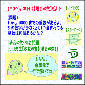 [算数合格]【算太・数子】(場合の数)整数問題*---------------------*【算数合格トラの巻】【算太・数子の算数教室】(R)*---------------------*(o^-')b 本日はこの問題にチャレンジ☆「場合の数」の整数問題です♪ *---------------------* (^0^)/ 本日は【場合の数】だよ♪ (問題)1 から 10000 までの整数があるよ。5 の数字が少なくとも1つ含まれてる整数は何個あるかな? [場合の数・有名問題][う山先生【秒殺の書】(場合の数)] *---------------------* (*^ー^)ノ「場合の数」の「整数問題タイプ」で、さらに、よくある「有名問題」です☆ このタイプは、中学受験、高校受験、大学受験、公務員試験、などなど、何の試験でも出題されて不思議でない問題ですね。 「少なくとも~」という言葉は、場合の数では良く出てくる表現ですので、慣れておきましょう☆ 上級者は、【ダンロック】君も言ってますように。一行で秒殺してください♪(^o^)/制限時間は、上級者は1分以内です。慣れてない人は15分は頑張りましょう! う山先生の予想正答率は、30%です。 ではレッツ・ゴー!!☆(^o^)/ 答えは、[3439個]です *---------------------*中学受験・受験算数算数・プロ家庭教師・算数個人指導*---------------------*□□□□□□□□□□□□□□□□□□□□□□□□□□□□□□[発行者氏名] う山雄一[発行者web] 【算数合格トラの巻】 [著作] 【算太・数子の算数教室】(R) [著作] 【算遊記】 【算遊記】(geo) [仕事URL] http://www2.to/sansu [メール] sansu_gokaku@hotmail.com [ブログ] 【算数合格トラの巻】(アメブロ) [ブログ] 【算数合格トラの巻】(ヤフー) [ブログ] 【算太・数子の算数教室】(R)(アメブロ) □□□□□□□□□□□□□□□□□□□□□□□□□□□□□□ ☆