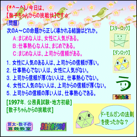 【数子ちゃんからの挑戦状2011】(公務員試験) *---------------------*【算数合格トラの巻】 【算太・数子の算数教室】(R)*---------------------*(o^-')b 本日はこの問題にチャレンジ☆【数子ちゃんからの挑戦状2011】(公務員試験) です☆ *---------------------*(*^ー^)ノこんにちは☆数子ちゃんです♪私から、小学生でも解ける『公務員試験問題』を出題いたしますね!【数子ちゃんからの挑戦状】です☆ (問題)次のA~Cの命題から正しく導かれる結論はどれか。 A:まじめな人は、女性に人気がある。B:仕事熱心な人は、まじめである。C:まじめな人は、上司から信頼がある。 1.女性に人気のある人は、上司からの信頼が厚い。2.仕事熱心でない人は、女性に人気がない。3.上司から信頼が厚くない人は、仕事熱心でない。4.女性に人気のない人は、上司からの信頼が厚くない。5.上司からの信頼の厚い人は、仕事熱心である。 [1997年.公務員試験・地方初級] [数子ちゃんからの挑戦状] *---------------------* (*^ー^)ノ2回目の【数子ちゃんからの挑戦状】です!今回の数子ちゃんの出題問題は、「命題の真偽」ですね。君は数子ちゃんの挑戦に勝てるかな?(^o^)/ 【ダンロック】君が言ってます、『ド・モルガンの法則』は知ってたらスゴイ!凄すぎる小学生です!(^^;気になった人は、ネットとかで調べてみましょうね! こういう問題は、「算数問題の読解力の養成」には持ってこい!ですね☆ さらに、こういう問題が『楽しい!』と思える人はOK!『楽しい!』と思えない人は、う山先生とみっちり勉強しましょう♪きっと好きになれますよ☆ う山先生の予想正答率は、30% です。(5つからの選択なので20%以上は固い?) ではレッツ・ゴー!! 答えは、[3]です。 *---------------------*中学受験・受験算数算数・プロ家庭教師・算数個人指導*---------------------*□□□□□□□□□□□□□□□□□□□□□□□□□□□□□□[発行者氏名] う山雄一[発行者web] 【算数合格トラの巻】 [著作] 【算太・数子の算数教室】(R) [著作] 【算遊記】 【算遊記】(geo) [仕事URL] http://www2.to/sansu [メール] sansu_gokaku@hotmail.com [ブログ] 【算数合格トラの巻】(アメブロ) [ブログ] 【算数合格トラの巻】(ヤフー) [ブログ] 【算太・数子の算数教室】(R)(アメブロ) □□□□□□□□□□□□□□□□□□□□□□□□□□□□□□ ☆