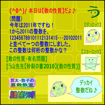 [算数合格]【算太・数子】(数の性質)有名問題*---------------------*【算数合格トラの巻】【算太・数子の算数教室】(R)*---------------------*(o^-')b 本日はこの問題にチャレンジ☆「数の性質」の有名問題です♪ *---------------------* (^0^)/ 本日は【数の性質】だよ♪ (問題)今年は2011年ですね!1から2011の整数を、 123456789101112131415・・・20102011 と並べて一つの整数にしました。この整数は何桁の整数かな? [数の性質・有名問題][う山先生【秒殺の書2010】(数の性質)] *---------------------* (*^ー^)ノ「数の性質」のよくある問題ですね☆ 【ダンロック】君も言ってますように、かなりデカイ数ですが、そんなに難しい問題ではありませんので、頑張ってみましょう♪(^o^)/制限時間は、上級者は2分以内です。慣れてない人でも5分で何とかなると思います。 そうそう!気をつけないと「4個少ない」というミスがよくありますので、ご注意下さい☆ う山先生の予想正答率は、60%です。 ではレッツ・ゴー!!☆(^o^)/ 答えは、[6937桁]です *---------------------*中学受験・受験算数算数・プロ家庭教師・算数個人指導*---------------------*□□□□□□□□□□□□□□□□□□□□□□□□□□□□□□[発行者氏名] う山雄一[発行者web] 【算数合格トラの巻】 [著作] 【算太・数子の算数教室】(R) [著作] 【算遊記】 【算遊記】(geo) [仕事URL] http://www2.to/sansu [メール] sansu_gokaku@hotmail.com [ブログ] 【算数合格トラの巻】(アメブロ) [ブログ] 【算数合格トラの巻】(ヤフー) [ブログ] 【算太・数子の算数教室】(R)(アメブロ) □□□□□□□□□□□□□□□□□□□□□□□□□□□□□□ ☆