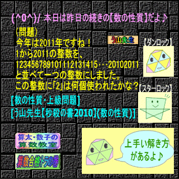 [算数合格]【算太・数子】(数の性質)上級問題*---------------------*【算数合格トラの巻】【算太・数子の算数教室】(R)*---------------------*(o^-')b 本日はこの問題にチャレンジ☆昨日の問題の続きで「数の性質」の上級問題です♪ *---------------------* (^0^)/ 本日は昨日の続きの【数の性質】だよ♪ (問題)今年は2011年ですね!1から2011の整数を、 123456789101112131415・・・20102011 と並べて一つの整数にしました。この整数に「2」は何個使われたかな? [数の性質・上級問題][う山先生【秒殺の書2010】(数の性質)] *---------------------* (*^ー^)ノ昨日の「数の性質」の問題の続きです☆昨日より、難しくなりましたよ! 【ダンロック】君も言ってますように、上手い解法がありますが、見つけられましたか?♪(^o^)/ 妙な解法ですと、泥沼にはまり込んでしまいますので、要注意です☆制限時間は、上級者は3分以内です。慣れてない人でも15分は考えたい問題です。 今週は、このタイプの問題の「う山先生式ウラワザ」を生徒に指導いたしました☆勿論、ネットでも説明いたします。 う山先生の予想正答率は、30%です。 ではレッツ・ゴー!!☆(^o^)/ 答えは、本日中(2011-02-25)に解答専用メールにご連絡あった方に解答を送信致します☆解けなくても、「解答希望」でOKです☆ [解答専用メール]sansu_gokaku@hotmail.co.jp 答えは、[●●●]です *---------------------*中学受験・受験算数算数・プロ家庭教師・算数個人指導*---------------------*□□□□□□□□□□□□□□□□□□□□□□□□□□□□□□[発行者氏名] う山雄一[発行者web] 【算数合格トラの巻】 [著作] 【算太・数子の算数教室】(R) [著作] 【算遊記】 【算遊記】(geo) [仕事URL] http://www2.to/sansu [メール] sansu_gokaku@hotmail.com [ブログ] 【算数合格トラの巻】(アメブロ) [ブログ] 【算数合格トラの巻】(ヤフー) [ブログ] 【算太・数子の算数教室】(R)(アメブロ) □□□□□□□□□□□□□□□□□□□□□□□□□□□□□□ ☆