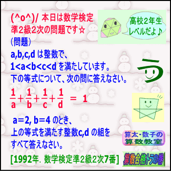 [算数合格]【算太・数子】(整数問題)数検準2級*---------------------*【算数合格トラの巻】【算太・数子の算数教室】(R)*---------------------*(o^-')b 本日はこの問題にチャレンジ☆1992年の[数学検定]準2級の2次問題7です☆ *---------------------*(^o^)/ 本日は数学検定準2級2次の問題です☆ (問題)a,b,c,d は整数で、1<a<b<c<d を満たしています。下の等式について、次の問に答えなさい。1/a+1/b+1/c+1/d=1 a=2, b=4 のとき、上の等式を満たす整数c,d の組をすべて答えなさい。 [1992年.数学検定準2級2次7番] *---------------------* (*^ー^)ノ平成4年の『数学検定』準2級2次7番です☆ 「整数問題」「数の性質」の問題ですね! 準2級ですから、高校2年終了レベルですね。しかも、2次の最後の問題です。君は解けるカナ? 昨日の生徒とは違いますが、指導している中学3年生が質問してきた問題です。 しかも、この問題を掲載している、「数学検定の対策」の本の解法が・・・悲しいくらいお間抜けな解法なのです。わかりにくいに、誰も気が付かない妙な解法です。さらに!その、お間抜けな解法を、その質問してきた生徒の塾の先生は、一生懸命に「間抜けな解法を説明していた」そうです(^^; う山先生の解法を訊いたら、スッキリ理解しました☆(^o^)/ 制限時間は、10分以内です。 う山先生の予想正答率は、中学3年生は、5%以下高校1年生は、10%以下高校2年生は、20%以下です。 ではレッツ・ゴー!!☆(^o^)/ 答えは、[(c,d)=(5,20),(6,12)]です。*---------------------*中学受験・受験算数算数・プロ家庭教師・算数個人指導*---------------------*□□□□□□□□□□□□□□□□□□□□□□□□□□□□□□[発行者氏名] う山雄一[発行者web] 【算数合格トラの巻】 [著作] 【算太・数子の算数教室】(R) [著作] 【算遊記】 【算遊記】(geo) [仕事URL] http://www2.to/sansu [メール] sansu_gokaku@hotmail.com [ブログ] 【算数合格トラの巻】(アメブロ) [ブログ] 【算数合格トラの巻】(ヤフー) [ブログ] 【算太・数子の算数教室】(アメブロ) □□□□□□□□□□□□□□□□□□□□□□□□□□□□□□ ☆