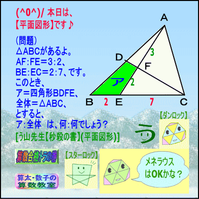 [算数合格]【算太・数子】(平面図形・上級問題)*---------------------*【算数合格トラの巻】【算太・数子の算数教室】(R)*---------------------*(o^-')b 本日はこの問題にチャレンジ☆平面図形の上級問題です♪ *---------------------* (^0^)/ 本日は、【平面図形】です♪(問題)△ABCがあるよ。AF:FE=3:2、BE:EC=2:7、です。このとき、ア=四角形BDFE、全体=△ABC、とすると、ア:全体 は、何:何でしょう? [う山先生【秒殺の書】(平面図形)] *---------------------* (*^ー^)ノ平面図形の上級問題を作成しました☆ 上級問題ですが、さらに上級者は「秒殺可能問題」です。 【ダンロック】君も言ってますが、『メネラウスの定理』はOKですか?(o^-')b もちろん、『メネラウスの定理』を中学受験のウラワザで初めて紹介したのは、【算太・数子の算数教室】(R)ですね♪ (参考) *===============================* 【算太・数子の算数教室】(R)1994年・平成6年 5月作品(通算2号)【チェバの定理】【メネラウスの定理】 *===============================* 1994年ですから、今から17年も前になるんですね!これ以来、いろんな本でも『メネラウスの定理』が紹介されるようになりました。 本日の問題ですが、『メネラウスの定理』のちょこっと応用ですよ☆頑張ってみて下さい。 制限時間は、20分以内です。解けなくても、自分で図を描いたりして、いろいろ考えてみましょう。 う山先生の予想正答率は、この時期ですと、5%以下です。 ではレッツ・ゴー!!☆(^o^)/ 答えは、本日中(2011-02-23)に解答専用メールにご連絡あった方に解答を送信致します☆解けなくても、「解答希望」でOKです☆ [解答専用メール]sansu_gokaku@hotmail.co.jp 答えは、[●●●]です *---------------------*中学受験・受験算数算数・プロ家庭教師・算数個人指導*---------------------*□□□□□□□□□□□□□□□□□□□□□□□□□□□□□□[発行者氏名] う山雄一[発行者web] 【算数合格トラの巻】 [著作] 【算太・数子の算数教室】(R) [著作] 【算遊記】 【算遊記】(geo) [仕事URL] http://www2.to/sansu [メール] sansu_gokaku@hotmail.com [ブログ] 【算数合格トラの巻】(アメブロ) [ブログ] 【算数合格トラの巻】(ヤフー) [ブログ] 【算太・数子の算数教室】(R)(アメブロ) □□□□□□□□□□□□□□□□□□□□□□□□□□□□□□ ☆