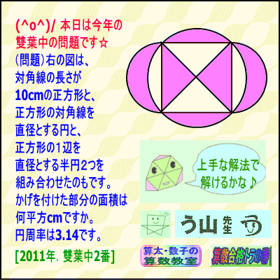 [算数合格]【算太・数子】(平面図形)雙葉中2011*---------------------*【算数合格トラの巻】【算太・数子の算数教室】(R)*---------------------*(o^-')b 本日はこの問題にチャレンジ☆今年、2011年の雙葉中に問題2です☆ *---------------------*(^o^)/ 本日は今年の雙葉中の問題です☆ (問題)図は、対角線の長さが10cmの正方形と、正方形の対角線を直径とする円と、正方形の1辺を直径とする半円2つを組み合わせたのもです。かげを付けた部分の面積は何平方cmですか。円周率は3.14です。 [2011年.雙葉中2番] *---------------------* (*^ー^)ノ先日の雙葉中の入試問題のです☆ 難しい平面図形の問題ではありませんが、テクニックもウラワザも何もなしで戦いを挑むと、返り討ちに遭ってしまうかもしれません。 解けたとしても、前半の難易度の高くない問題に膨大な時間を費やしては後半の問題に行き着くまでに時間がなくなってしまいそうです。 この問題も、『解き方コンテスト』で扱って観たい問題ですね☆ 君は天才的に解けるかな?(^o^)/ 制限時間は、5分以内です。 う山先生の予想正答率は、新6年生は、30%以下です。 ではレッツ・ゴー!!☆(^o^)/ 答えは、[64.25平方cm] です。 (今週末の個人指導・ネット指導などにてビックリするようなウラワザ解法で説明致します) *---------------------*中学受験・受験算数算数・プロ家庭教師・算数個人指導*---------------------*□□□□□□□□□□□□□□□□□□□□□□□□□□□□□□[発行者氏名] う山雄一[発行者web] 【算数合格トラの巻】 [著作] 【算太・数子の算数教室】(R) [著作] 【算遊記】 【算遊記】(geo) [仕事URL] http://www2.to/sansu [メール] sansu_gokaku@hotmail.com [ブログ] 【算数合格トラの巻】(アメブロ) [ブログ] 【算数合格トラの巻】(ヤフー) [ブログ] 【算太・数子の算数教室】(R)(アメブロ) □□□□□□□□□□□□□□□□□□□□□□□□□□□□□□□□□□□□□□□□□□ ☆