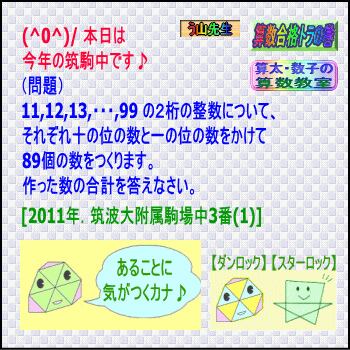 [算数合格]【算太・数子】(数の性質)筑波大附属駒場中2011*---------------------*【算数合格トラの巻】【算太・数子の算数教室】(R)*---------------------*(o^-')b 本日はこの問題にチャレンジ☆今年、2011年の筑駒中の問題3(1)です☆ *---------------------* (^0^)/ 本日は今年の筑駒中です♪ (問題)11,12,13,・・・,99 の2桁の整数について、それぞれ十の位の数と一の位の数をかけて89個の数をつくります。作った数の合計を答えなさい。[2011年.筑波大附属駒場中3番(1)] *---------------------* (*^ー^)ノ今年、平成23年の筑波大附属駒場中の数の性質の問題のです☆ なかなかの良問です☆一見難しい問題のようですが・・・ちょっと考えれば、「あっ! なるほど!」ということになり、さらに上級者は、「こんなように計算出来る!」と気が付くと思います☆ さらに!昔からの【算太・数子の算数教室】のファンの受験生、バックナンバーをお持ちの受験生は、「あっ! これ、途中から、う山先生のウラワザで計算簡単じゃん!」と思い出しますね☆(^o^)/(ちなみに、1998年・平成10年12月作品[通算57号]のウラワザですよ) 「【算太数子】のウラワザで簡単に、筑駒の問題を解きました!」 という受験生がいましたら、執筆者冥利に尽きます☆ 制限時間は、5分以内です。全然解き方がわからない人は、表を書いたりして頑張りましょう!時間は20分くらいかかってもOKです☆ う山先生の予想正答率は、新6年生は、20%です。 ではレッツ・ゴー!!☆(^o^)/ 答えは、[2025] です。 *---------------------*中学受験・受験算数算数・プロ家庭教師・算数個人指導*---------------------*□□□□□□□□□□□□[発行者氏名] 【う山雄一】[発行者web] 【算数合格トラの巻】[著作]【算太・数子の算数教室】(R)[著作]【算遊記】[仕事URL]http://www2.to/sansuhttp://www.alpha-net.ne.jp/users2/popopo/[仕事用メール] sansu_gokaku@hotmail.com[ブログ] 【算数合格トラの巻】 [ブログ] 【算太・数子の算数教室】(R)□□□□□□□□□□□□ ☆
