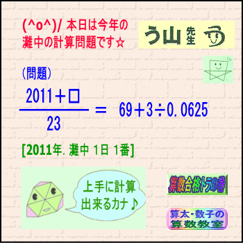 [算数合格]【算太・数子】(計算)灘中2011*---------------------*【算数合格トラの巻】【算太・数子の算数教室】(R)*---------------------*(o^-')b 本日はこの問題にチャレンジ☆今年、2011年の灘中・1日の1番です☆ *---------------------* (^0^)/ 本日は今年の灘中の計算問題です♪(問題)(2011+□)÷23=69+3÷0.0625[2011年.灘中 1日 1番] *---------------------* (*^ー^)ノ今年、平成23年の灘中の『計算問題』です☆ 難しくはありませんが、「0.0625」を君はどのように処理するかな?? 【ダンロック】君も計算の上手に出来るカナ?と言ってます♪ 「え~と、625/10000 にして、 5で割って、また5で割って・・・」 なんてチマチマやってますと、【ダンロック】君に笑われてしまいますよ!(^^; う山先生は、算数の指導のときに『計算の工夫力が大切』といつも言っています☆君の工夫力はどうかな? 制限時間は、2分以内です。 う山先生の予想正答率は、60%です。正解することは大切ですが、工夫出来たかどうかが勝負ですよ☆ ではレッツ・ゴー!!☆(^o^)/ 答えは、[680] です。 *---------------------*中学受験・受験算数算数・プロ家庭教師・算数個人指導*---------------------*□□□□□□□□□□□□[発行者氏名] 【う山雄一】[発行者web] 【算数合格トラの巻】[著作]【算太・数子の算数教室】(R)[著作]【算遊記】[仕事URL]http://www2.to/sansuhttp://www.alpha-net.ne.jp/users2/popopo/[仕事用メール] sansu_gokaku@hotmail.com[ブログ] 【算数合格トラの巻】 [ブログ] 【算太・数子の算数教室】(R)□□□□□□□□□□□□ ☆