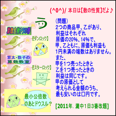 [算数合格]【算太・数子】(数の性質)灘中2011*---------------------*【算数合格トラの巻】【算太・数子の算数教室】(R)*---------------------*(o^-')b 本日はこの問題にチャレンジ☆今年、2011年.灘中の問題3の改題です♪ *---------------------* (^0^)/ 本日は【数の性質】だよ♪ (問題)2つの商品甲、乙があり、利益はそれぞれ原価の20%、14%で、甲、乙ともに、原価も利益も1円未満の端数はありません。また、甲を1つ売ったときと乙を1つ売ったときの利益は同じです。甲の原価として考えられる金額のうち、最も安いのは□円です。 [2011年.灘中1日3番改題] *---------------------* (*^ー^)ノ今年、平成23年の灘中の売買算をモチーフにした数の性質ですね☆ 【ダンロック】君も言ってますが、「最小公倍数のあとドースル?」のでしょうか。そのまま、甲の原価を求めて、答えにしてしまいますか!? まさか、そんな単純な問題が入試に出てくるわけありませんよね!(^^; この問題も、灘中自慢の傑作問題だと思います☆数字は、う山先生が替えた問題ですが、一生懸命考えてみましょう! 制限時間は、20分以内です。解けなくても良いですから、じっくり考えてみたい問題です。 う山先生の予想正答率は、10%です。 ではレッツ・ゴー!!☆(^o^)/ 答えは、本日中(2011-02-20)に解答専用メールにご連絡あった方に解答を送信致します☆解けなくても、「解答希望」でOKです☆ [解答専用メール]sansu_gokaku@hotmail.co.jp 答えは、[●●●]です *---------------------*中学受験・受験算数算数・プロ家庭教師・算数個人指導*---------------------*□□□□□□□□□□□□□□□□□□□□□□□□□□□□□□[発行者氏名] う山雄一[発行者web] 【算数合格トラの巻】 [著作] 【算太・数子の算数教室】(R) [著作] 【算遊記】 【算遊記】(geo) [仕事URL] http://www2.to/sansu [メール] sansu_gokaku@hotmail.com [ブログ] 【算数合格トラの巻】(アメブロ) [ブログ] 【算数合格トラの巻】(ヤフー) [ブログ] 【算太・数子の算数教室】(R)(アメブロ) □□□□□□□□□□□□□□□□□□□□□□□□□□□□□□ ☆