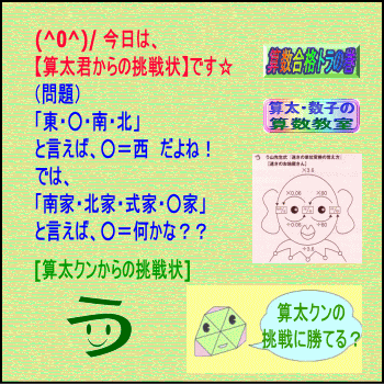 【算太クンからの挑戦状2011】(歴史)*---------------------*【算数合格トラの巻】【算太・数子の算数教室】(R)*---------------------*(o^-')b 本日はこの問題にチャレンジ☆【算太クンからの挑戦状2011】(歴史) です☆ *---------------------*(^^)/ ボク算太クン!今日は、歴史が得意な君にボクからの挑戦状だよ☆ (問題)「東・○・南・北」と言えば、○=西 だよね!では、「南家・北家・式家・○家」と言えば、○=何かな?? [算太クンからの挑戦状] *---------------------* (*^ー^)ノ大人気☆【算太クンからの挑戦状】です!さてさて算太クンが、君たちに挑戦してきました!今回は「歴史」です。君は算太クンの挑戦に勝てるかな?(^o^)/ 今回はちょこっとやさしめの挑戦状ですね! 出来れば、ヒントなしで気が付いて貰いたい問題です☆ それでも、ヒントが欲しい人は・・・ ↓ ↓ ↓ ↓ ↓ ↓ 「藤原家」ですよ~!そう!「藤原四家」ですね☆ う山先生の予想正答率は、30%以下 です。 ではレッツ・ゴー!! 答えは、[○=京]です。 (藤原四家は「南家・北家・式家・京家」です) *---------------------*中学受験・受験算数算数・プロ家庭教師・算数個人指導*---------------------*□□□□□□□□□□□□[発行者氏名] 【う山雄一】[発行者web] 【算数合格トラの巻】[著作]【算太・数子の算数教室】(R)[著作]【算遊記】[仕事URL]http://www2.to/sansuhttp://www.alpha-net.ne.jp/users2/popopo/[仕事用メール] sansu_gokaku@hotmail.com[ブログ] 【算数合格トラの巻】 [ブログ] 【算太・数子の算数教室】(R)□□□□□□□□□□□□ ☆