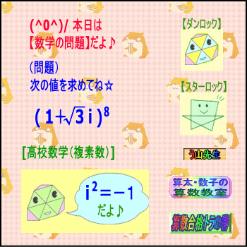 [算数合格]【算太・数子】(高校数学)複素数*---------------------*【算数合格トラの巻】【算太・数子の算数教室】(R)*---------------------*(o^-')b 本日はこの問題にチャレンジ☆高校2年生レベルの問題です♪ *---------------------*(^0^)/ 本日は【数学の問題】だよ♪ (問題)次の値を求めてね☆(1+√3i)の8乗 [高校数学(複素数)] *---------------------* (*^ー^)ノ高等数学です☆ルート3 とか、8乗とか、文字で上手に表現できなくてスイマセン!貼り付けた図には、綺麗に表現されてますので、ご容赦下さい。 本日の問題は、中学3年生、高校1年生の計算力の力業でも解けなくないですが、ここは、高校2年生範囲の「複素数・複素数平面」で勉強する、【極形式】と【ド・モアブルの定理】で、格好良くスマートに解きたいですね☆(^o^)/ 制限時間は、高校生は5分以内です。【ド・モアブルの定理】を忘れてたり、知らなかったりですと20分です。 う山先生の予想正答率は、中学生・高校1年生は、スゴイ人か頑張った人しか解けないので、15%以下です。高校2年生以上は、30%は解けると思いたいですが、文系の学生にはキビシイかもです。(^^; ではレッツ・ゴー!!☆(^o^)/ この問題は、「公式に当てはめ」で指導する先生、家庭教師が大多数と思います。【ド・モアブルの定理】の理論、概念もしっかり教えてくれる人がいいですね♪(^o^)/ 答えは、[-128+128√3i] です。 *---------------------*中学受験・受験算数算数・プロ家庭教師・算数個人指導*---------------------*□□□□□□□□□□□□[発行者氏名] う山雄一[発行者web] 【算数合格トラの巻】 [著作] 【算太・数子の算数教室】(R) [著作] 【算遊記】 【算遊記】(geo) [仕事URL] http://www2.to/sansu [メール] sansu_gokaku@hotmail.com [ブログ] 【算数合格トラの巻】(アメブロ) [ブログ] 【算数合格トラの巻】(ヤフー) [ブログ] 【算太・数子の算数教室】(R)(アメブロ) □□□□□□□□□□□□ ☆