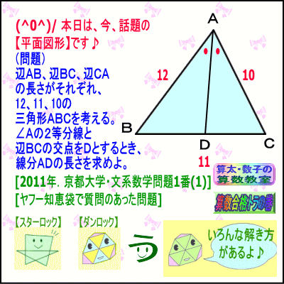 [算数合格]【算太・数子】(話題の平面図形)*---------------------*【算数合格トラの巻】【算太・数子の算数教室】(R)*---------------------*(o^-')b 本日はこの問題にチャレンジ☆今、日本中で話題になっています、京都大学の平面図形の問題です♪ *---------------------* (^0^)/ 本日は、今、話題の【平面図形】です♪ (問題)辺AB、辺BC、辺CAの長さがそれぞれ、12、11、10の三角形ABCを考える。∠Aの2等分線と辺BCの交点をDとするとき、線分ADの長さを求めよ。 [2011年.京都大学・文系数学問題1番(1)][ヤフー知恵袋で質問のあった問題] *---------------------* (*^ー^)ノヤフー知恵袋を悪用した、新しいカンニング(?)で、今、日本中で話題になってますね☆ ん~・・・話題になってるのは、「カンニング」に関してだけで、「実際の問題」はあまり話題になってないのでしょうか?(^^; このブログでは、京都大学の問題の中身について考えていきます☆ 【ダンロック】君も言ってますように、いろんな解法のある問題です。 大学受験予備校の模範解答は、『余弦定理』を使った解法がほとんどでしょうか? しかし!この問題は、う山先生に言わせれば、・[中学生の解法]・[高校生の解法]・[公務員志望者] などなどいろいろありますよ☆ 君の才能でいろいろやって見ましょう!(o^-')b 答えが「ルート」が入ってきますので、小学生はかなりキビシイかもです(^^; また、昨日、早稲田大・慶應大の教え子と話ししたのですが、「う山先生! 京大を受験するなら、 この問題くらいパっと解かないとマズイですよね!?」と言ってました。勿論、同意見です☆ 制限時間は、1分以内(ウラワザを知ってる人)、5分以内(普通の解法)、15分以内(いろいろ考えたい人)です。 う山先生の予想正答率は、中学生20%以下、高校生50%です。 ではレッツ・ゴー!!☆(^o^)/ 答えは、[3√10]です *---------------------*中学受験・受験算数算数・プロ家庭教師・算数個人指導*---------------------*□□□□□□□□□□□□□□□□□□□□□□□□□□□□□□ クリック応援、お願いします↓☆ヾ( ´ー`)にほんブログ村 中学受験(塾・指導・勉強法) こちらもお願い致します☆↓(*^▽^*)【人気ブログランキングへ】 □□□□□□□□□□□□□□□□□□□□□□□□□□□□□□[発行者氏名] う山雄一[発行者web] 【算数合格トラの巻】 [著作] 【算太・数子の算数教室】(R) [著作] 【算遊記】 【算遊記】(geo) [仕事URL] http://www2.to/sansu [メール] sansu_gokaku@hotmail.com [ブログ] 【算数合格トラの巻】(アメブロ) [ブログ] 【算数合格トラの巻】(ヤフー) [ブログ] 【算太・数子の算数教室】(R)(アメブロ) □□□□□□□□□□□□□□□□□□□□□□□□□□□□□□ (●´ω`●)ゞ