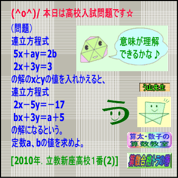 [算数合格]【算太・数子】(計算)立教新座高2010*---------------------*【算数合格トラの巻】【算太・数子の算数教室】(R)*---------------------*(o^-')b 本日はこの問題にチャレンジ☆2010年の立教新座高校の問題1(2)です☆ *---------------------*(^o^)/ 本日は高校入試問題です☆ (問題)連立方程式5x+ay=2b2x+3y=3の解のxとyの値を入れかえると、 連立方程式2x-5y=-17bx+3y=a+5の解になるという。定数a、bの値を求めよ。 [2010年.立教新座高校1番(2)] *---------------------* (*^ー^)ノ平成22年の立教新座高校の「計算問題」です☆そう!立教中学でなくて、立教高校です☆ 【ダンロック君】がヒントで言ってますが、「問題の意味が良くわからない」という受験生が続出かも知れません。 指導している中学生が質問してきた問題ですが、その生徒も問題の意味を勘違いしてドツボにはまっていた問題です☆(^o^)/ 制限時間は、10分以内です。 う山先生の予想正答率は、中学3年生は、20%以下です。 ではレッツ・ゴー!!☆(^o^)/ 答えは、[a=-7、b=11 ]です。*---------------------*中学受験・受験算数算数・プロ家庭教師・算数個人指導*---------------------*□□□□□□□□□□□□□□□□□□□□□□□□□□□□□□中学受験・受験算数・算数プロ家庭教師・算数個人指導□□□□□□□□□□□□□□□□□□□□□□□□□□□□□□[発行者氏名] う山雄一[発行者web] 【算数合格トラの巻】 [著作] 【算太・数子の算数教室】(R) [著作] 【算遊記】 【算遊記】(geo) [仕事URL] http://www2.to/sansu [メール] sansu_gokaku@hotmail.com [ブログ] 【算数合格トラの巻】(アメブロ) [ブログ] 【算数合格トラの巻】(ヤフー) [ブログ] 【算太・数子の算数教室】(アメブロ) □□□□□□□□□□□□□□□□□□□□□□□□□□□□□□ ☆