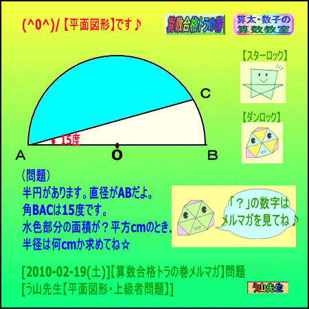 [算数]【算数合格トラの巻・メルマガ 2011-02-19】(予告)*---------------------*【算数合格トラの巻】【算太・数子の算数教室】(R)*---------------------*(o^-')b 本日、昼12時に、メルマガ発送予約をしました☆ *---------------------*(*^ー^)ノ今回のメルマガは、【平面図形】の応用問題です☆ 今回も、GIFの図もブログに貼っておきました☆ [?平方cm]の、[?]の具体的な数字は、メールマガジンを読んで下さいね♪ 上級者問題ですが、【算太・数子の算数教室】(R)のウラワザを上手に使えば思ったより簡単に解けるかもしれませんよ☆頑張って下さい! *---------------------*中学受験・受験算数算数・プロ家庭教師・算数個人指導*---------------------*□□□□□□□□□□□□□□□□□□□□□□□□□□□□□□[発行者氏名] う山雄一[発行者web] 【算数合格トラの巻】 [著作] 【算太・数子の算数教室】(R) [著作] 【算遊記】 【算遊記】(geo) [仕事URL] http://www2.to/sansu [メール] sansu_gokaku@hotmail.com [ブログ] 【算数合格トラの巻】(アメブロ) [ブログ] 【算数合格トラの巻】(ヤフー) [ブログ] 【算太・数子の算数教室】(R)(アメブロ) □□□□□□□□□□□□□□□□□□□□□□□□□□□□□□ ☆