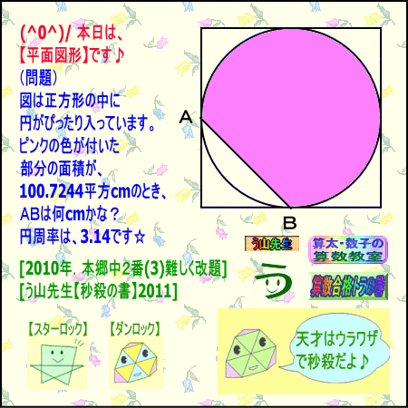 [算数合格]【算太・数子】(平面図形)本郷中2010*---------------------*【算数合格トラの巻】【算太・数子の算数教室】(R)*---------------------*(o^-')b 本日はこの問題にチャレンジ☆昨年、2010年.本郷中の問題2(3)の改題です♪ *---------------------* (^0^)/ 本日は、【平面図形】です♪ (問題)図は正方形の中に円がぴったり入っています。ピンクの色が付いた部分の面積が、100.7244平方cmのとき、ABは何cmかな?円周率は、3.14です☆ [2010年.本郷中2番(3)難しく改題][う山先生【秒殺の書】2011] *---------------------* (*^ー^)ノ昨年、平成22年の本郷中の「平面図形」問題を難しくしてみました☆ 「図形の考え方」「図形のセンス」が問われる問題は勿論のこと、「計算力」「数のセンス」も必要になってくる問題です。 さあ、じっくりと考えてみて下さい☆ 制限時間は、15分以内です。解けなくても、考えれば考えただけ力になりますよ! う山先生の予想正答率は、3%です。 ではレッツ・ゴー!!☆(^o^)/ 答えは、[8.4cm]です 【ダンロック】君も言ってますが、実は、天才は秒殺可能問題です♪今週の土日に指導予定です。みんなも天才になっちゃおう!☆(^o^)/ *---------------------*中学受験・受験算数算数・プロ家庭教師・算数個人指導*---------------------*□□□□□□□□□□□□[発行者氏名] う山雄一[発行者web] 【算数合格トラの巻】 [著作] 【算太・数子の算数教室】(R) [著作] 【算遊記】 【算遊記】(geo) [仕事URL] http://www2.to/sansu [メール] sansu_gokaku@hotmail.com [ブログ] 【算数合格トラの巻】(アメブロ) [ブログ] 【算数合格トラの巻】(ヤフー) [ブログ] 【算太・数子の算数教室】(R)(アメブロ) □□□□□□□□□□□□ ☆