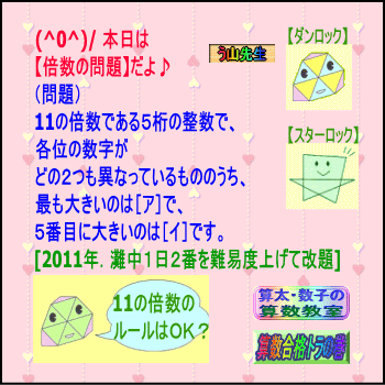 [算数合格]【算太・数子】(数の性質)灘中2011*---------------------*【算数合格トラの巻】【算太・数子の算数教室】(R)*---------------------*(o^-')b 本日はこの問題にチャレンジ☆今年、2011年.灘中の問題2の改題です♪ *---------------------* (^0^)/ 本日は【倍数の問題】だよ♪ (問題)11の倍数である5桁の整数で、各位の数字がどの2つも異なっているもののうち、最も大きいのは[ア]で、5番目に大きいのは[イ]です。 [2011年.灘中1日2番を難易度上げて改題] *---------------------* (*^ー^)ノ今年、平成23年の灘中の数の性質の「倍数問題」です☆ 【ダンロック】君も言ってますが、【11の倍数の法則】は御存知ですか? 【算太・数子の算数教室】のバックナンバー、---------------------------------『算太・数子の算数教室』(通算73号)2002年9月発行数の性質研究テーマ1【循環小数】テーマ2【数に親しもう】【11の倍数発見法】---------------------------------に、楽しく覚えられるように、詳しく書きました☆今週は、生徒に配る予定です。 またまた、 「【算太数子】の覚え方で、灘中の問題を解きました!」 という受験生がいましたら、執筆者冥利に尽きます☆ しかし、2011年2月3日のブログ記事、今年の麻布中の入試問題もしかり、本日の灘中の問題もしかり、今年は[11の倍数問題]が人気でしたね!(^^) 制限時間は、[ア]は10分以内です。[イ]は解けなくても、20分くらい考えたい問題です。 う山先生の予想正答率は、[ア]は、20%です。(塾やネットでも解説してますよね!)[イ]は、2%です。(う山先生の改題が解けますか?) ではレッツ・ゴー!!☆(^o^)/ 答えは、本日中(2011-02-13)に解答専用メールにご連絡あった方に解答を送信致します☆解けなくても、「解答希望」でOKです☆ [解答専用メール]sansu_gokaku@hotmail.co.jp 答えは、[●●●]です *---------------------*中学受験・受験算数算数・プロ家庭教師・算数個人指導*---------------------*□□□□□□□□□□□□[発行者氏名] う山雄一[発行者web] 【算数合格トラの巻】 [著作] 【算太・数子の算数教室】(R) [著作] 【算遊記】 【算遊記】(geo) [仕事URL] http://www2.to/sansu [メール] sansu_gokaku@hotmail.com [ブログ] 【算数合格トラの巻】(アメブロ) [ブログ] 【算数合格トラの巻】(ヤフー) [ブログ] 【算太・数子の算数教室】(R)(アメブロ) □□□□□□□□□□□□ ☆