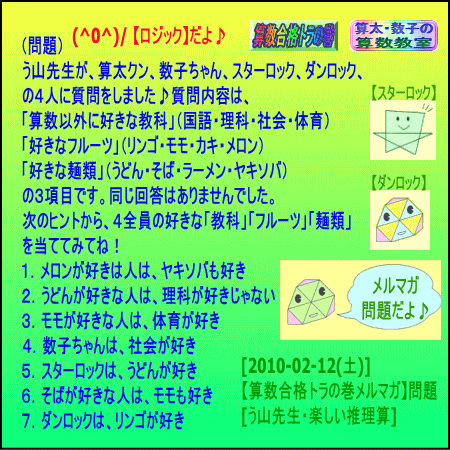 [算数]【算数合格トラの巻・メルマガ 2011-02-12】(予告)*---------------------*【算数合格トラの巻】【算太・数子の算数教室】(R)*---------------------*(o^-')b 本日、夜7時に、メルマガ発送予約をしました☆ *---------------------*(*^ー^)ノ楽しい【推理算】問題です☆ 今回も、GIFの図もブログに貼っておきました☆ 楽しい問題ですので、いろいろ図や表を書いたり、 ご家族で考えてみて下さい♪ 「ロジック」ですから、算数だけでなく、国語力もアップしますよ♪ *---------------------*中学受験・受験算数算数・プロ家庭教師・算数個人指導*---------------------*□□□□□□□□□□□□[発行者氏名] う山雄一[発行者web] 【算数合格トラの巻】 [著作] 【算太・数子の算数教室】(R) [著作] 【算遊記】 【算遊記】(geo) [仕事URL] http://www2.to/sansu [メール] sansu_gokaku@hotmail.com [ブログ] 【算数合格トラの巻】(アメブロ) [ブログ] 【算数合格トラの巻】(ヤフー) [ブログ] 【算太・数子の算数教室】(R)(アメブロ) □□□□□□□□□□□□ ☆