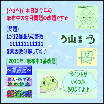 [算数合格]【算太・数子】(数の性質)麻布中2011*---------------------*【算数合格トラの巻】【算太・数子の算数教室】(R)*---------------------*(o^-')b 本日はこの問題にチャレンジ☆今年、2011年の麻布中に問題1の改題です☆ *---------------------*(^o^)/ 本日は今年の麻布中の注目問題の改題です☆ (問題)1が12個並んだ整数 111111111111を素因数分解してね♪ [2011年.麻布中1番改題] *---------------------* (*^ー^)ノ一昨日の麻布中の入試問題の改題です☆ 君はこの12桁の整数を素因数分解出来るカナ? 麻布中関係の掲示板や、入試問題研究の掲示板などを見てみますと、「今年の算数は難しかった!」などのカキコミが多数ありました。たぶん、受験生が「難しかった!」「出来なかった!」「時間を使いすぎて失敗した!」としたら、この最初の問題かもしれません。 実際の麻布中の1番の問題は、ネットなどで掲載されてますので、御覧になって下さい。 う山先生は、『このような問題の、 重要な考え方を知らなかったのでは?』と思います。勿論、麻布中を受験するレベルですから、11の倍数の法則などは先刻ご承知のハズ! 1001=7×11×13だって、知っていて当然でしょう。 う山先生が言いたいのは、『そのような偏差値60レベルの常識以上の、 あることに気が付かなかったのでは?』 ということです☆(^o^)/ 制限時間は、10分以内です。 う山先生の予想正答率は、1%です。 ではレッツ・ゴー!!☆(^o^)/ 答え及び解説は、今週末の個人指導・ネット指導などにて。 *---------------------*中学受験・受験算数算数・プロ家庭教師・算数個人指導*---------------------*□□□□□□□□□□□□□□□□□□□□□□□□□□□□□□[発行者氏名] う山雄一[発行者web] 【算数合格トラの巻】 [著作] 【算太・数子の算数教室】(R) [著作] 【算遊記】 【算遊記】(geo) [仕事URL] http://www2.to/sansu [メール] sansu_gokaku@hotmail.com [ブログ] 【算数合格トラの巻】(アメブロ) [ブログ] 【算数合格トラの巻】(ヤフー) [ブログ] 【算太・数子の算数教室】(アメブロ) □□□□□□□□□□□□□□□□□□□□□□□□□□□□□□ ☆