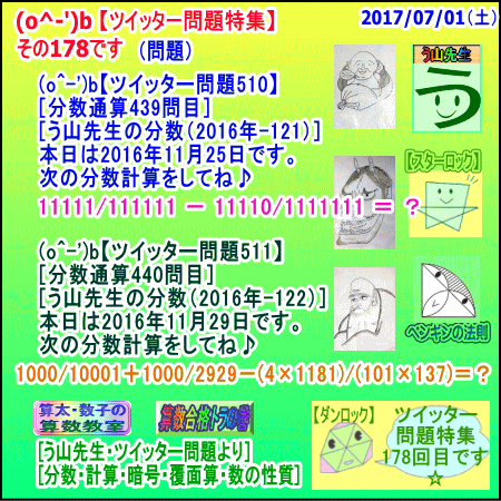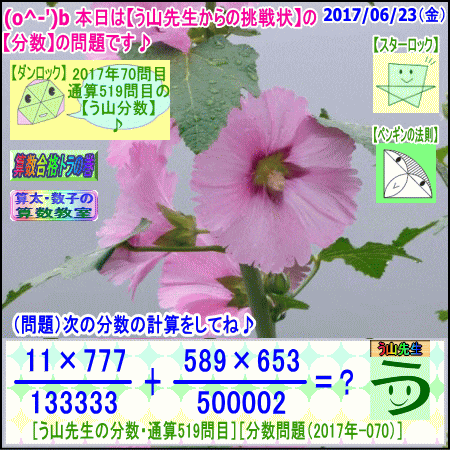 [う山雄一先生の分数][2017年6月23日]算数・数学天才問題【分数519問目】 ※─────────────────────────※ 【算太・数子の算数教室】(R) 【算数合格トラの巻】 ※─────────────────────────※ (o^-')b 大人気☆[う山先生式・分数計算]の問題です♪ ※─────────────────────────※ □ 2017/06/23(金) (o^-')b【ツイッター問題590】 [う山先生の分数・通算519問目] [分数問題(2017年-070)] 本日は2017年06月23日です。 次の分数計算をしてね♪ (11×777)/133333 +(589×653)/500002 = ? □ 【答え】後程♪ □ ※─────────────────────────※ (*^ー^)ノ[う山先生の分数(2017年-070)]です☆ 本日も面白い分数を作成しました♪ 分子・分母ともどうなるかな♪ ※─────────────────────────※ 中学受験算数・数学・算数数学プロ家庭教師・個人指導 ※─────────────────────────※ □ □□□□□□□□□□□□□□□□□□□□□□□□□□□ [発行者氏名]【う山雄一】 [発行者web]【算数合格トラの巻】 [発行者web]【算太・数子の算数教室】(R) [著作]【算太・数子の算数教室】(R) 「さんた・かずこのさんすうきょうしつ」 [著作]【算遊記】 □ [仕事URL] https://sansu.theblog.me/ http://santakazuko.wix.com/uyama http://www.geocities.jp/sansu_gokaku_toranomaki/ □ [成績表・偏差値アップ] http://www.geocities.jp/santa_kazuko_1994/ □ [算遊記(さんゆうき)]算蔵法師・算悟空 http://www.geocities.jp/san_yu_ki/ □ [仕事用フェイスブック] https://www.facebook.com/kazuko.santa.5 □ [仕事用メール] ??????@hotmail.com ??????@gmail.com □ [ブログ]【算数合格トラの巻】 http://ameblo.jp/sansu/ http://blogs.yahoo.co.jp/sansu_gokaku_toranomaki http://uyama.blog.jp/ □ [ブログ]【算太・数子の算数教室】(R) http://ameblo.jp/santa-kazuko/ http://blogs.yahoo.co.jp/santa_kazuko_1994 http://blog.goo.ne.jp/santa_kazuko http://santakazuko.wordpress.com/ http://santa-kazuko.at.webry.info/ http://santa-kazuko.blogspot.jp/ http://ch.nicovideo.jp/santa-kazuko http://santa-kazuko.blog.jp/ □ [ブログ]【う山先生】 http://happy.ap.teacup.com/uyama/ http://blog.livedoor.jp/sansu/ http://blogs.yahoo.co.jp/san_yu_ki http://sansugokaku.blog.fc2.com/ □ [ブログ]【オルドビスキー博士】 http://ameblo.jp/ordovisky/ □ [動画配信]【う山TV】 http://www.geocities.jp/sansu_gokaku_toranomaki/3-uyama-tv [分数、楽しい!]シリーズ [分数で算数・数学の天才になろう♪]シリーズ [知的ゲーム]シリーズ [一瞬で解こう!]シリーズ [解けたら天才♪]シリーズ [家庭教師]シリーズ [算数・面白い問題]シリーズ [算数・数学ファイル/SSファイル]シリーズ □ □□□□□□□□□□□□□□□□□□□□□□□□□□□ ☆ ☆ ☆ ☆ ☆ ☆ ☆