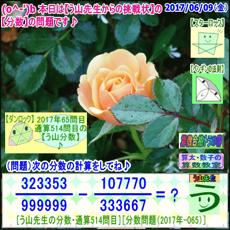 [う山雄一先生の分数][2017年6月9日]算数・数学天才問題【分数514問目】 ※─────────────────────────※ 【算太・数子の算数教室】(R) 【算数合格トラの巻】 ※─────────────────────────※ (o^-')b 大人気☆[う山先生式・分数計算]の問題です♪ ※─────────────────────────※ □ 2017/06/09(金) (o^-')b【ツイッター問題585】 [う山先生の分数・通算514問目] [分数問題(2017年-065)] 本日は2017年06月09日です。 次の分数計算をしてね♪ 323353/999999 - 107770/333667 = ? □ 【答え】後程♪ □ ※─────────────────────────※ (*^ー^)ノ[う山先生の分数(2017年-065)]です☆ 本日も面白い分数を作成しました♪ 分子・分母ともどうなるかな♪ ※─────────────────────────※ 中学受験算数・数学・算数数学プロ家庭教師・個人指導 ※─────────────────────────※ □ □□□□□□□□□□□□□□□□□□□□□□□□□□□ [発行者氏名]【う山雄一】 [発行者web]【算数合格トラの巻】 [発行者web]【算太・数子の算数教室】(R) [著作]【算太・数子の算数教室】(R) 「さんた・かずこのさんすうきょうしつ」 [著作]【算遊記】 □ [仕事URL] https://sansu.theblog.me/ http://santakazuko.wix.com/uyama http://www.geocities.jp/sansu_gokaku_toranomaki/ □ [成績表・偏差値アップ] http://www.geocities.jp/santa_kazuko_1994/ □ [算遊記(さんゆうき)]算蔵法師・算悟空 http://www.geocities.jp/san_yu_ki/ □ [仕事用フェイスブック] https://www.facebook.com/kazuko.santa.5 □ [仕事用メール] ??????@hotmail.com ??????@gmail.com □ [ブログ]【算数合格トラの巻】 http://ameblo.jp/sansu/ http://blogs.yahoo.co.jp/sansu_gokaku_toranomaki http://uyama.blog.jp/ □ [ブログ]【算太・数子の算数教室】(R) http://ameblo.jp/santa-kazuko/ http://blogs.yahoo.co.jp/santa_kazuko_1994 http://blog.goo.ne.jp/santa_kazuko http://santakazuko.wordpress.com/ http://santa-kazuko.at.webry.info/ http://santa-kazuko.blogspot.jp/ http://ch.nicovideo.jp/santa-kazuko http://santa-kazuko.blog.jp/ □ [ブログ]【う山先生】 http://happy.ap.teacup.com/uyama/ http://blog.livedoor.jp/sansu/ http://blogs.yahoo.co.jp/san_yu_ki http://sansugokaku.blog.fc2.com/ □ [ブログ]【オルドビスキー博士】 http://ameblo.jp/ordovisky/ □ [動画配信]【う山TV】 http://www.geocities.jp/sansu_gokaku_toranomaki/3-uyama-tv [分数、楽しい!]シリーズ [分数で算数・数学の天才になろう♪]シリーズ [知的ゲーム]シリーズ [一瞬で解こう!]シリーズ [解けたら天才♪]シリーズ [家庭教師]シリーズ [算数・面白い問題]シリーズ [算数・数学ファイル/SSファイル]シリーズ □ □□□□□□□□□□□□□□□□□□□□□□□□□□□ ☆ ☆ ☆ ☆ ☆ ☆ ☆