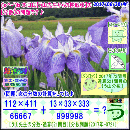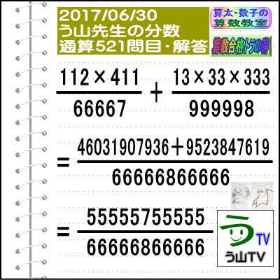 [う山雄一先生の分数][2017年6月30日]算数・数学天才問題【分数521問目】 ※─────────────────────────※ 【算太・数子の算数教室】(R) 【算数合格トラの巻】 ※─────────────────────────※ (o^-')b 大人気☆[う山先生式・分数計算]の問題です♪ ※─────────────────────────※ □ 2017/06/30(金) (o^-')b【ツイッター問題592】 [う山先生の分数・通算521問目] [分数問題(2017年-072)] 本日は2017年06月30日です。 次の分数計算をしてね♪ (112×411)/66667 +(13×33×333)/999998 = ? □ 【答え】後程♪ □ ※─────────────────────────※ (*^ー^)ノ[う山先生の分数(2017年-072)]です☆ 本日も面白い分数を作成しました♪ 分子・分母ともどうなるかな♪ ※─────────────────────────※ 中学受験算数・数学・算数数学プロ家庭教師・個人指導 ※─────────────────────────※ □ □□□□□□□□□□□□□□□□□□□□□□□□□□□ [発行者氏名]【う山雄一】 [発行者web]【算数合格トラの巻】 [発行者web]【算太・数子の算数教室】(R) [著作]【算太・数子の算数教室】(R) 「さんた・かずこのさんすうきょうしつ」 [著作]【算遊記】 □ [仕事URL] https://sansu.theblog.me/ http://santakazuko.wix.com/uyama http://www.geocities.jp/sansu_gokaku_toranomaki/ □ [成績表・偏差値アップ] http://www.geocities.jp/santa_kazuko_1994/ □ [算遊記(さんゆうき)]算蔵法師・算悟空 http://www.geocities.jp/san_yu_ki/ □ [仕事用フェイスブック] https://www.facebook.com/kazuko.santa.5 □ [仕事用メール] ??????@hotmail.com ??????@gmail.com □ [ブログ]【算数合格トラの巻】 http://ameblo.jp/sansu/ http://blogs.yahoo.co.jp/sansu_gokaku_toranomaki http://uyama.blog.jp/ □ [ブログ]【算太・数子の算数教室】(R) http://ameblo.jp/santa-kazuko/ http://blogs.yahoo.co.jp/santa_kazuko_1994 http://blog.goo.ne.jp/santa_kazuko http://santakazuko.wordpress.com/ http://santa-kazuko.at.webry.info/ http://santa-kazuko.blogspot.jp/ http://ch.nicovideo.jp/santa-kazuko http://santa-kazuko.blog.jp/ □ [ブログ]【う山先生】 http://happy.ap.teacup.com/uyama/ http://blog.livedoor.jp/sansu/ http://blogs.yahoo.co.jp/san_yu_ki http://sansugokaku.blog.fc2.com/ □ [ブログ]【オルドビスキー博士】 http://ameblo.jp/ordovisky/ □ [動画配信]【う山TV】 http://www.geocities.jp/sansu_gokaku_toranomaki/3-uyama-tv [分数、楽しい!]シリーズ [分数で算数・数学の天才になろう♪]シリーズ [知的ゲーム]シリーズ [一瞬で解こう!]シリーズ [解けたら天才♪]シリーズ [家庭教師]シリーズ [算数・面白い問題]シリーズ [算数・数学ファイル/SSファイル]シリーズ □ □□□□□□□□□□□□□□□□□□□□□□□□□□□ ☆ ☆ ☆ ☆ ☆ ☆ ☆