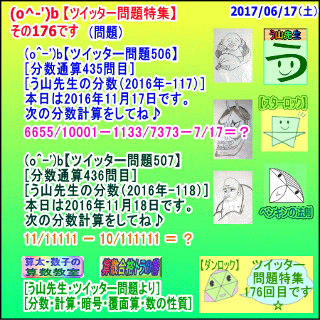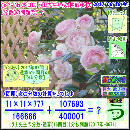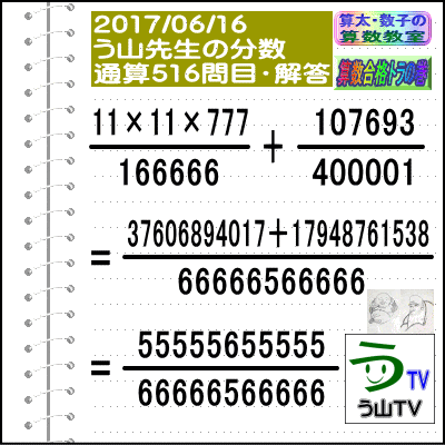 [う山雄一先生の分数][2017年6月16日]算数・数学天才問題【分数516問目】 ※─────────────────────────※ 【算太・数子の算数教室】(R) 【算数合格トラの巻】 ※─────────────────────────※ (o^-')b 大人気☆[う山先生式・分数計算]の問題です♪ ※─────────────────────────※ □ 2017/06/16(金) (o^-')b【ツイッター問題587】 [う山先生の分数・通算516問目] [分数問題(2017年-067)] 本日は2017年06月16日です。 次の分数計算をしてね♪ (11×11×777)/166666 + 107693/400001 = ? □ 【答え】後程♪ □ ※─────────────────────────※ (*^ー^)ノ[う山先生の分数(2017年-067)]です☆ 本日も面白い分数を作成しました♪ 分子・分母ともどうなるかな♪ ※─────────────────────────※ 中学受験算数・数学・算数数学プロ家庭教師・個人指導 ※─────────────────────────※ □ □□□□□□□□□□□□□□□□□□□□□□□□□□□ [発行者氏名]【う山雄一】 [発行者web]【算数合格トラの巻】 [発行者web]【算太・数子の算数教室】(R) [著作]【算太・数子の算数教室】(R) 「さんた・かずこのさんすうきょうしつ」 [著作]【算遊記】 □ [仕事URL] https://sansu.theblog.me/ http://santakazuko.wix.com/uyama http://www.geocities.jp/sansu_gokaku_toranomaki/ □ [成績表・偏差値アップ] http://www.geocities.jp/santa_kazuko_1994/ □ [算遊記(さんゆうき)]算蔵法師・算悟空 http://www.geocities.jp/san_yu_ki/ □ [仕事用フェイスブック] https://www.facebook.com/kazuko.santa.5 □ [仕事用メール] ??????@hotmail.com ??????@gmail.com □ [ブログ]【算数合格トラの巻】 http://ameblo.jp/sansu/ http://blogs.yahoo.co.jp/sansu_gokaku_toranomaki http://uyama.blog.jp/ □ [ブログ]【算太・数子の算数教室】(R) http://ameblo.jp/santa-kazuko/ http://blogs.yahoo.co.jp/santa_kazuko_1994 http://blog.goo.ne.jp/santa_kazuko http://santakazuko.wordpress.com/ http://santa-kazuko.at.webry.info/ http://santa-kazuko.blogspot.jp/ http://ch.nicovideo.jp/santa-kazuko http://santa-kazuko.blog.jp/ □ [ブログ]【う山先生】 http://happy.ap.teacup.com/uyama/ http://blog.livedoor.jp/sansu/ http://blogs.yahoo.co.jp/san_yu_ki http://sansugokaku.blog.fc2.com/ □ [ブログ]【オルドビスキー博士】 http://ameblo.jp/ordovisky/ □ [動画配信]【う山TV】 http://www.geocities.jp/sansu_gokaku_toranomaki/3-uyama-tv [分数、楽しい!]シリーズ [分数で算数・数学の天才になろう♪]シリーズ [知的ゲーム]シリーズ [一瞬で解こう!]シリーズ [解けたら天才♪]シリーズ [家庭教師]シリーズ [算数・面白い問題]シリーズ [算数・数学ファイル/SSファイル]シリーズ □ □□□□□□□□□□□□□□□□□□□□□□□□□□□ ☆ ☆ ☆ ☆ ☆ ☆ ☆