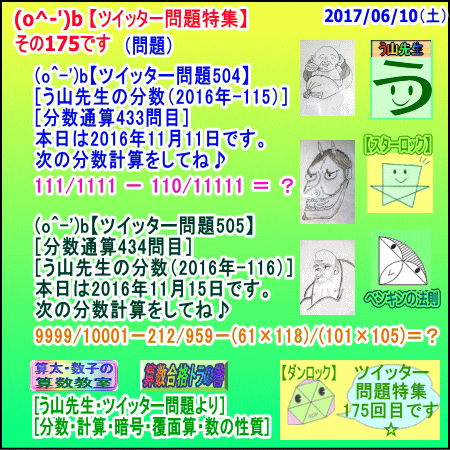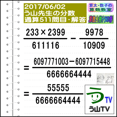 [う山雄一先生の分数][2017年6月1日]算数・数学天才問題【分数510問目】 ※─────────────────────────※ 【算太・数子の算数教室】(R) 【算数合格トラの巻】 ※─────────────────────────※ (o^-')b 大人気☆[う山先生式・分数計算]の問題です♪ ※─────────────────────────※ □ 2017/06/01(木) (o^-')b【ツイッター問題581】 [う山先生の分数・通算510問目] [分数問題(2017年-061)] 本日は2017年06月01日です。 次の分数計算をしてね♪ (472×521)/554551 -(53×72)/11111 = ? □ 【答え】後程♪ □ ※─────────────────────────※ (*^ー^)ノ[う山先生の分数(2017年-061)]です☆ 本日、6月1日にふさわしい、面白い分数を作成しました♪ 分子・分母ともどうなるかな♪ ※─────────────────────────※ 中学受験算数・数学・算数数学プロ家庭教師・個人指導 ※─────────────────────────※ □ □□□□□□□□□□□□□□□□□□□□□□□□□□□ [発行者氏名]【う山雄一】 [発行者web]【算数合格トラの巻】 [発行者web]【算太・数子の算数教室】(R) [著作]【算太・数子の算数教室】(R) 「さんた・かずこのさんすうきょうしつ」 [著作]【算遊記】 □ [仕事URL] https://sansu.theblog.me/ http://santakazuko.wix.com/uyama http://www.geocities.jp/sansu_gokaku_toranomaki/ □ [成績表・偏差値アップ] http://www.geocities.jp/santa_kazuko_1994/ □ [算遊記(さんゆうき)]算蔵法師・算悟空 http://www.geocities.jp/san_yu_ki/ □ [仕事用フェイスブック] https://www.facebook.com/kazuko.santa.5 □ [仕事用メール] ??????@hotmail.com ??????@gmail.com □ [ブログ]【算数合格トラの巻】 http://ameblo.jp/sansu/ http://blogs.yahoo.co.jp/sansu_gokaku_toranomaki http://uyama.blog.jp/ □ [ブログ]【算太・数子の算数教室】(R) http://ameblo.jp/santa-kazuko/ http://blogs.yahoo.co.jp/santa_kazuko_1994 http://blog.goo.ne.jp/santa_kazuko http://santakazuko.wordpress.com/ http://santa-kazuko.at.webry.info/ http://santa-kazuko.blogspot.jp/ http://ch.nicovideo.jp/santa-kazuko http://santa-kazuko.blog.jp/ □ [ブログ]【う山先生】 http://happy.ap.teacup.com/uyama/ http://blog.livedoor.jp/sansu/ http://blogs.yahoo.co.jp/san_yu_ki http://sansugokaku.blog.fc2.com/ □ [ブログ]【オルドビスキー博士】 http://ameblo.jp/ordovisky/ □ [動画配信]【う山TV】 http://www.geocities.jp/sansu_gokaku_toranomaki/3-uyama-tv [分数、楽しい!]シリーズ [分数で算数・数学の天才になろう♪]シリーズ [知的ゲーム]シリーズ [一瞬で解こう!]シリーズ [解けたら天才♪]シリーズ [家庭教師]シリーズ [算数・面白い問題]シリーズ [算数・数学ファイル/SSファイル]シリーズ □ □□□□□□□□□□□□□□□□□□□□□□□□□□□ ☆ ☆ ☆ ☆ ☆ ☆ ☆