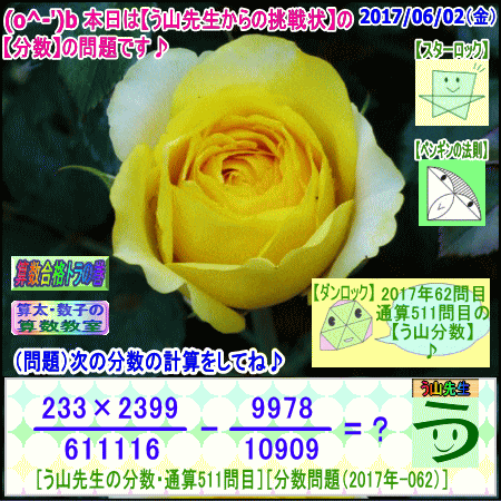 [う山雄一先生の分数][2017年6月2日]算数・数学天才問題【分数511問目】 ※─────────────────────────※ 【算太・数子の算数教室】(R) 【算数合格トラの巻】 ※─────────────────────────※ (o^-')b 大人気☆[う山先生式・分数計算]の問題です♪ ※─────────────────────────※ □ 2017/06/02(金) (o^-')b【ツイッター問題582】 [う山先生の分数・通算511問目] [分数問題(2017年-062)] 本日は2017年06月02日です。 次の分数計算をしてね♪ (233×2399)/611116 - 9978/10909 = ? □ 【答え】後程♪ □ ※─────────────────────────※ (*^ー^)ノ[う山先生の分数(2017年-062)]です☆ 本日も面白い分数を作成しました♪ 分子・分母ともどうなるかな♪ ※─────────────────────────※ 中学受験算数・数学・算数数学プロ家庭教師・個人指導 ※─────────────────────────※ □ □□□□□□□□□□□□□□□□□□□□□□□□□□□ [発行者氏名]【う山雄一】 [発行者web]【算数合格トラの巻】 [発行者web]【算太・数子の算数教室】(R) [著作]【算太・数子の算数教室】(R) 「さんた・かずこのさんすうきょうしつ」 [著作]【算遊記】 □ [仕事URL] https://sansu.theblog.me/ http://santakazuko.wix.com/uyama http://www.geocities.jp/sansu_gokaku_toranomaki/ □ [成績表・偏差値アップ] http://www.geocities.jp/santa_kazuko_1994/ □ [算遊記(さんゆうき)]算蔵法師・算悟空 http://www.geocities.jp/san_yu_ki/ □ [仕事用フェイスブック] https://www.facebook.com/kazuko.santa.5 □ [仕事用メール] ??????@hotmail.com ??????@gmail.com □ [ブログ]【算数合格トラの巻】 http://ameblo.jp/sansu/ http://blogs.yahoo.co.jp/sansu_gokaku_toranomaki http://uyama.blog.jp/ □ [ブログ]【算太・数子の算数教室】(R) http://ameblo.jp/santa-kazuko/ http://blogs.yahoo.co.jp/santa_kazuko_1994 http://blog.goo.ne.jp/santa_kazuko http://santakazuko.wordpress.com/ http://santa-kazuko.at.webry.info/ http://santa-kazuko.blogspot.jp/ http://ch.nicovideo.jp/santa-kazuko http://santa-kazuko.blog.jp/ □ [ブログ]【う山先生】 http://happy.ap.teacup.com/uyama/ http://blog.livedoor.jp/sansu/ http://blogs.yahoo.co.jp/san_yu_ki http://sansugokaku.blog.fc2.com/ □ [ブログ]【オルドビスキー博士】 http://ameblo.jp/ordovisky/ □ [動画配信]【う山TV】 http://www.geocities.jp/sansu_gokaku_toranomaki/3-uyama-tv [分数、楽しい!]シリーズ [分数で算数・数学の天才になろう♪]シリーズ [知的ゲーム]シリーズ [一瞬で解こう!]シリーズ [解けたら天才♪]シリーズ [家庭教師]シリーズ [算数・面白い問題]シリーズ [算数・数学ファイル/SSファイル]シリーズ □ □□□□□□□□□□□□□□□□□□□□□□□□□□□ ☆ ☆ ☆ ☆ ☆ ☆ ☆