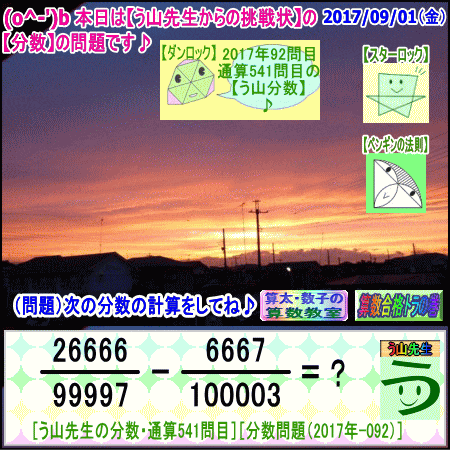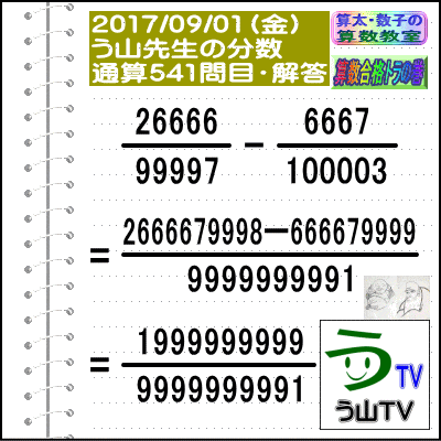 [う山雄一先生の分数][2017年9月1日]算数・数学天才問題【分数541問目】 ※────────────────────────※ 【算太・数子の算数教室】(R) 【算数合格トラの巻】 ※─────────────────────────※ (o^-')b 大人気☆[う山先生式・分数計算]の問題です♪ ※─────────────────────────※ □ 2017/09/01(金) (o^-')b【ツイッター問題612】 [う山先生の分数・通算541問目] [分数問題(2017年-092)] 本日は2017年09月01日です。 次の分数計算をしてね♪ 26666/99997 ー 6667/100003 = ? □ 【答え】後程♪ □ ※─────────────────────────※ (*^ー^)ノ[う山先生の分数(2017年-092)]です☆ 本日は、「9月1日にふさわしい」面白い分数を作成しました♪ 分子・分母ともどうなるかな♪ 初めの式も、面白い形になりました。 ※─────────────────────────※ 中学受験算数・数学・算数数学プロ家庭教師・個人指導 ※─────────────────────────※ □ □□□□□□□□□□□□□□□□□□□□□□□□□□□ [発行者氏名]【う山雄一】 [発行者web]【算数合格トラの巻】 [発行者web]【算太・数子の算数教室】(R) [著作]【算太・数子の算数教室】(R) 「さんた・かずこのさんすうきょうしつ」 [著作]【算遊記】 □ [仕事URL] https://sansu.theblog.me/ http://santakazuko.wix.com/uyama http://www.geocities.jp/sansu_gokaku_toranomaki/ □ [成績表・偏差値アップ] http://www.geocities.jp/santa_kazuko_1994/ □ [算遊記(さんゆうき)]算蔵法師・算悟空 http://www.geocities.jp/san_yu_ki/ □ [仕事用フェイスブック] https://www.facebook.com/kazuko.santa.5 □ [仕事用メール] ??????@hotmail.com ??????@gmail.com □ [ブログ]【算数合格トラの巻】 http://ameblo.jp/sansu/ http://blogs.yahoo.co.jp/sansu_gokaku_toranomaki http://uyama.blog.jp/ □ [ブログ]【算太・数子の算数教室】(R) http://ameblo.jp/santa-kazuko/ http://blogs.yahoo.co.jp/santa_kazuko_1994 http://blog.goo.ne.jp/santa_kazuko http://santakazuko.wordpress.com/ http://santa-kazuko.at.webry.info/ http://santa-kazuko.blogspot.jp/ http://ch.nicovideo.jp/santa-kazuko http://santa-kazuko.blog.jp/ □ [ブログ]【う山先生】 http://happy.ap.teacup.com/uyama/ http://blog.livedoor.jp/sansu/ http://blogs.yahoo.co.jp/san_yu_ki http://sansugokaku.blog.fc2.com/ □ [ブログ]【オルドビスキー博士】 http://ameblo.jp/ordovisky/ □ [動画配信]【う山TV】(スタディ/バラエティ) http://www.geocities.jp/sansu_gokaku_toranomaki/3-uyama-tv [分数、楽しい!]シリーズ [分数で算数・数学の天才になろう♪]シリーズ [知的ゲーム]シリーズ [一瞬で解こう!]シリーズ [解けたら天才♪]シリーズ [家庭教師]シリーズ [算数・面白い問題]シリーズ [算数・数学ファイル/SSファイル]シリーズ □ □□□□□□□□□□□□□□□□□□□□□□□□□□□ ☆ ☆ ☆ ☆ ☆ ☆ ☆