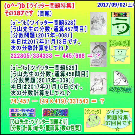算数・分数[ツイッター問題特集187]算太数子の算数教室 【2017/09/02】算数合格トラの巻 ※─────────────────────────※ 【う山雄一先生・ツイッター問題】まとめ ※─────────────────────────※ 【算数合格トラの巻】 【算太・数子の算数教室】(R) ※─────────────────────────※ (o^-')b 本日は[分数問題]のまとめです♪ ※─────────────────────────※ □ ◆本日の問題◆ 【う山先生・算数ツイッター問題・No528,529】 □ 2017/09/02(土) □ (o^-')b 【ツイッター問題特集】その187です♪ □ (問題) □ 2017/01/13(金) (o^-')b【ツイッター問題528】 [う山先生の分数・通算457問目] [分数問題(2017年-008)] 本日は2017年01月13日です。 次の分数計算をしてね♪ 222805/334333 - 445/668 = ? □ □ 2017/01/15(日) (o^-')b【ツイッター問題529】 [う山先生の分数・通算458問目] [分数問題(2017年-009)] 本日は2017年01月15日です。 次の分数計算をしてね♪ 74/457 - (49×419)/331543 = ? □ ■ □ [う山先生・ツイッター問題より] [分数・計算・暗号・覆面算・数の性質] □ ※─────────────────────────※ (*^ー^)ノ 「ツイッター問題のまとめ」です☆ □ 【ダンロック】君が言ってますように、 『ツイッター問題特集 187回目です☆』 です。 □ 本日の「抜粋問題」は上記2問です☆(^0^)/ □ [う山先生の分数]を楽しんで解いて、 【分数で算数合格】しましょう☆(o^-')b □ う山先生の予想正答率は、 2問正解 → 15%以下 1問正解 → 30%以下 です。 □ ではレッツ・ゴー!! ☆(^o^)/ □ 答えは、 ↓ ↓ ↓ ↓ ↓ ↓ ↓ ↓ ↓ □ ♪( ´θ`)ノ【ツイッター問題528】解答 [う山先生の分数・通算457問目] [分数問題(2017年-008)] (解法) 222805/334333 - 445/668 =148833740/223334444 - 148778185/223334444 =55555/223334444 □ 【答え】[55555/223334444]です。 (分子=55555) (分母=223334444) (本日は2が2個・3が3個・4が4個・5が5個の面白い分数を作成しました♪) (先週は1が1個・2が2個・3が3個・4が4個の面白い分数を作成しました♪) □ □ ♪( ´θ`)ノ【ツイッター問題529】解答 [う山先生の分数・通算458問目] [分数問題(2017年-009)] (解法) 74/457 - (49×419)/331543 =74/457 - 20531/331543 =24534182/151515151 - 9382667/151515151 =15151515/151515151 □ 【答え】[15151515/151515151]です。 (分子=15151515→8個) (分母=151515151→9個) (本日1月15日に相応しい、面白い分数を作成しました♪) □ □ ※─────────────────────────※ 中学受験算数・数学・算数数学プロ家庭教師・個人指導 ※─────────────────────────※ □□□□□□□□□□□□□□□□□□□□□□□□□□□ [発行者氏名]【う山雄一】 [発行者web]【算数合格トラの巻】 [発行者web]【算太・数子の算数教室】(R) [著作]【算太・数子の算数教室】(R) 「さんた・かずこのさんすうきょうしつ」 [著作]【算遊記】 □ [仕事URL] https://sansu.theblog.me/ http://santakazuko.wix.com/uyama http://www.geocities.jp/sansu_gokaku_toranomaki/ □ [成績表・偏差値アップ] http://www.geocities.jp/santa_kazuko_1994/ □ [算遊記(さんゆうき)]算蔵法師・算悟空 http://www.geocities.jp/san_yu_ki/ □ [仕事用フェイスブック] https://www.facebook.com/kazuko.santa.5 □ [仕事用メール] ??????@hotmail.com ??????@gmail.com □ [ブログ]【算数合格トラの巻】 http://ameblo.jp/sansu/ http://blogs.yahoo.co.jp/sansu_gokaku_toranomaki http://uyama.blog.jp/ □ [ブログ]【算太・数子の算数教室】(R) http://ameblo.jp/santa-kazuko/ http://blogs.yahoo.co.jp/santa_kazuko_1994 http://blog.goo.ne.jp/santa_kazuko http://santakazuko.wordpress.com/ http://santa-kazuko.at.webry.info/ http://santa-kazuko.blogspot.jp/ http://ch.nicovideo.jp/santa-kazuko http://santa-kazuko.blog.jp/ □ [ブログ]【う山先生】 http://happy.ap.teacup.com/uyama/ http://blog.livedoor.jp/sansu/ http://blogs.yahoo.co.jp/san_yu_ki http://sansugokaku.blog.fc2.com/ □ [ブログ]【オルドビスキー博士】 http://ameblo.jp/ordovisky/ □ [動画配信]【う山TV】(スタディ/バラエティ) http://www.geocities.jp/sansu_gokaku_toranomaki/3-uyama-tv [分数、楽しい!]シリーズ [分数で算数・数学の天才になろう♪]シリーズ [知的ゲーム]シリーズ [一瞬で解こう!]シリーズ [解けたら天才♪]シリーズ [家庭教師]シリーズ [算数・面白い問題]シリーズ [算数・数学ファイル/SSファイル]シリーズ □ □□□□□□□□□□□□□□□□□□□□□□□□□□□ ☆ ☆ ☆ ☆ ☆ ☆ ☆