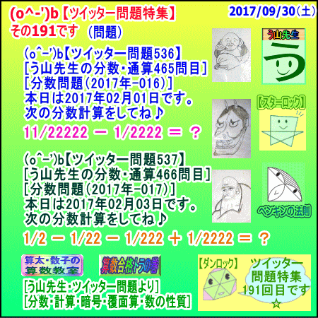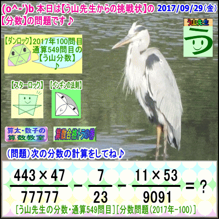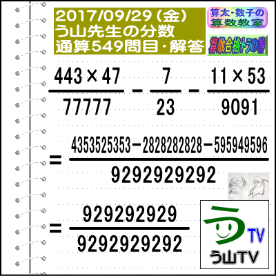 [う山雄一先生の分数][2017年9月29日]算数・数学天才問題【分数549問目】 ※────────────────────────※ 【算太・数子の算数教室】(R) 【算数合格トラの巻】 ※─────────────────────────※ (o^-')b 大人気☆[う山先生式・分数計算]の問題です♪ ※─────────────────────────※ □ 2017/09/29(金) (o^-')b【ツイッター問題620】 [う山先生の分数・通算549問目] [分数問題(2017年-100)] 本日は2017年09月29日です。 次の分数計算をしてね♪ (443×47)/44444 - 7/23 -(11×53)/9091 = ? □ 【答え】後程♪ □ ※─────────────────────────※ (*^ー^)ノ[う山先生の分数(2017年-100)]です☆ 本日、9月29日に相応しい面白い分数を作成しました♪ 分子・分母ともどうなるかな♪ 今年のちょうど100問目です☆ ※─────────────────────────※ 中学受験算数・数学・算数数学プロ家庭教師・個人指導 ※─────────────────────────※ □ □□□□□□□□□□□□□□□□□□□□□□□□□□□ [発行者氏名]【う山雄一】 [発行者web]【算数合格トラの巻】 [発行者web]【算太・数子の算数教室】(R) [著作]【算太・数子の算数教室】(R) 「さんた・かずこのさんすうきょうしつ」 [著作]【算遊記】 □ [仕事URL]メイン http://www.geocities.jp/sansu_gokaku_toranomaki/ [仕事URL]サブ https://sansu.theblog.me/ http://santakazuko.wix.com/uyama □ [成績表・偏差値アップ] http://www.geocities.jp/santa_kazuko_1994/ □ [算遊記(さんゆうき)]算蔵法師・算悟空 http://www.geocities.jp/san_yu_ki/ □ [仕事用フェイスブック] https://www.facebook.com/kazuko.santa.5 □ [仕事用メール] ??????@hotmail.com ??????@gmail.com □ [ブログ]【算数合格トラの巻】 http://ameblo.jp/sansu/ http://blogs.yahoo.co.jp/sansu_gokaku_toranomaki http://uyama.blog.jp/ □ [ブログ]【算太・数子の算数教室】(R) http://ameblo.jp/santa-kazuko/ http://blogs.yahoo.co.jp/santa_kazuko_1994 http://blog.goo.ne.jp/santa_kazuko http://santakazuko.wordpress.com/ http://santa-kazuko.at.webry.info/ http://santa-kazuko.blogspot.jp/ http://ch.nicovideo.jp/santa-kazuko http://santa-kazuko.blog.jp/ □ [ブログ]【う山先生】 http://happy.ap.teacup.com/uyama/ http://blog.livedoor.jp/sansu/ http://blogs.yahoo.co.jp/san_yu_ki http://sansugokaku.blog.fc2.com/ □ [ブログ]【オルドビスキー博士】 http://ameblo.jp/ordovisky/ □ [動画配信]【う山TV】(スタディ/バラエティ) http://www.geocities.jp/sansu_gokaku_toranomaki/3-uyama-tv [分数、楽しい!]シリーズ [分数で算数・数学の天才になろう♪]シリーズ [知的ゲーム]シリーズ [一瞬で解こう!]シリーズ [解けたら天才♪]シリーズ [家庭教師]シリーズ [算数・面白い問題]シリーズ [算数・数学ファイル/SSファイル]シリーズ 【音楽・作曲】シリーズ □ □□□□□□□□□□□□□□□□□□□□□□□□□□□ ☆ ☆ ☆ ☆ ☆ ☆ ☆