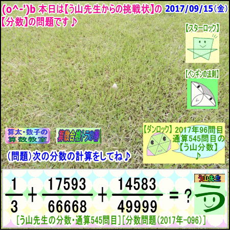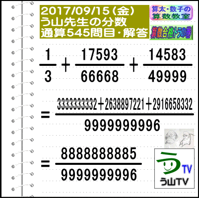 [う山雄一先生の分数][2017年9月15日]算数・数学天才問題【分数545問目】 ※────────────────────────※ 【算太・数子の算数教室】(R) 【算数合格トラの巻】 ※─────────────────────────※ (o^-')b 大人気☆[う山先生式・分数計算]の問題です♪ ※─────────────────────────※ □ 2017/09/15(金) (o^-')b【ツイッター問題616】 [う山先生の分数・通算545問目] [分数問題(2017年-096)] 本日は2017年09月15日です。 次の分数計算をしてね♪ 1/3 + 17593/66668 + 14583/49999 = ? □ 【答え】後程♪ □ ※─────────────────────────※ (*^ー^)ノ[う山先生の分数(2017年-096)]です☆ 本日も面白い分数を作成しました♪ 分子・分母ともどうなるかな♪ ※─────────────────────────※ 中学受験算数・数学・算数数学プロ家庭教師・個人指導 ※─────────────────────────※ □ □□□□□□□□□□□□□□□□□□□□□□□□□□□ [発行者氏名]【う山雄一】 [発行者web]【算数合格トラの巻】 [発行者web]【算太・数子の算数教室】(R) [著作]【算太・数子の算数教室】(R) 「さんた・かずこのさんすうきょうしつ」 [著作]【算遊記】 □ [仕事URL] https://sansu.theblog.me/ http://santakazuko.wix.com/uyama http://www.geocities.jp/sansu_gokaku_toranomaki/ □ [成績表・偏差値アップ] http://www.geocities.jp/santa_kazuko_1994/ □ [算遊記(さんゆうき)]算蔵法師・算悟空 http://www.geocities.jp/san_yu_ki/ □ [仕事用フェイスブック] https://www.facebook.com/kazuko.santa.5 □ [仕事用メール] ??????@hotmail.com ??????@gmail.com □ [ブログ]【算数合格トラの巻】 http://ameblo.jp/sansu/ http://blogs.yahoo.co.jp/sansu_gokaku_toranomaki http://uyama.blog.jp/ □ [ブログ]【算太・数子の算数教室】(R) http://ameblo.jp/santa-kazuko/ http://blogs.yahoo.co.jp/santa_kazuko_1994 http://blog.goo.ne.jp/santa_kazuko http://santakazuko.wordpress.com/ http://santa-kazuko.at.webry.info/ http://santa-kazuko.blogspot.jp/ http://ch.nicovideo.jp/santa-kazuko http://santa-kazuko.blog.jp/ □ [ブログ]【う山先生】 http://happy.ap.teacup.com/uyama/ http://blog.livedoor.jp/sansu/ http://blogs.yahoo.co.jp/san_yu_ki http://sansugokaku.blog.fc2.com/ □ [ブログ]【オルドビスキー博士】 http://ameblo.jp/ordovisky/ □ [動画配信]【う山TV】(スタディ/バラエティ) http://www.geocities.jp/sansu_gokaku_toranomaki/3-uyama-tv [分数、楽しい!]シリーズ [分数で算数・数学の天才になろう♪]シリーズ [知的ゲーム]シリーズ [一瞬で解こう!]シリーズ [解けたら天才♪]シリーズ [家庭教師]シリーズ [算数・面白い問題]シリーズ [算数・数学ファイル/SSファイル]シリーズ □ □□□□□□□□□□□□□□□□□□□□□□□□□□□ ☆ ☆ ☆ ☆ ☆ ☆ ☆