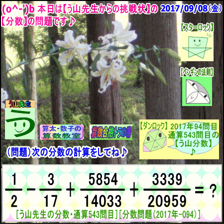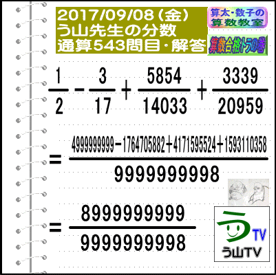 [う山雄一先生の分数][2017年9月8日]算数・数学天才問題【分数543問目】 ※────────────────────────※ 【算太・数子の算数教室】(R) 【算数合格トラの巻】 ※─────────────────────────※ (o^-')b 大人気☆[う山先生式・分数計算]の問題です♪ ※─────────────────────────※ □ 2017/09/08(金) (o^-')b【ツイッター問題614】 [う山先生の分数・通算543問目] [分数問題(2017年-094)] 本日は2017年09月08日です。 次の分数計算をしてね♪ 1/2 - 3/17 + 5854/14033 + 3339/20959 = ? □ 【答え】後程♪ □ ※─────────────────────────※ (*^ー^)ノ[う山先生の分数(2017年-094)]です☆ 本日は、「9月8日にふさわしい」面白い分数を作成しました♪ 分子・分母ともどうなるかな♪ ※─────────────────────────※ 中学受験算数・数学・算数数学プロ家庭教師・個人指導 ※─────────────────────────※ □ □□□□□□□□□□□□□□□□□□□□□□□□□□□ [発行者氏名]【う山雄一】 [発行者web]【算数合格トラの巻】 [発行者web]【算太・数子の算数教室】(R) [著作]【算太・数子の算数教室】(R) 「さんた・かずこのさんすうきょうしつ」 [著作]【算遊記】 □ [仕事URL] https://sansu.theblog.me/ http://santakazuko.wix.com/uyama http://www.geocities.jp/sansu_gokaku_toranomaki/ □ [成績表・偏差値アップ] http://www.geocities.jp/santa_kazuko_1994/ □ [算遊記(さんゆうき)]算蔵法師・算悟空 http://www.geocities.jp/san_yu_ki/ □ [仕事用フェイスブック] https://www.facebook.com/kazuko.santa.5 □ [仕事用メール] ??????@hotmail.com ??????@gmail.com □ [ブログ]【算数合格トラの巻】 http://ameblo.jp/sansu/ http://blogs.yahoo.co.jp/sansu_gokaku_toranomaki http://uyama.blog.jp/ □ [ブログ]【算太・数子の算数教室】(R) http://ameblo.jp/santa-kazuko/ http://blogs.yahoo.co.jp/santa_kazuko_1994 http://blog.goo.ne.jp/santa_kazuko http://santakazuko.wordpress.com/ http://santa-kazuko.at.webry.info/ http://santa-kazuko.blogspot.jp/ http://ch.nicovideo.jp/santa-kazuko http://santa-kazuko.blog.jp/ □ [ブログ]【う山先生】 http://happy.ap.teacup.com/uyama/ http://blog.livedoor.jp/sansu/ http://blogs.yahoo.co.jp/san_yu_ki http://sansugokaku.blog.fc2.com/ □ [ブログ]【オルドビスキー博士】 http://ameblo.jp/ordovisky/ □ [動画配信]【う山TV】(スタディ/バラエティ) http://www.geocities.jp/sansu_gokaku_toranomaki/3-uyama-tv [分数、楽しい!]シリーズ [分数で算数・数学の天才になろう♪]シリーズ [知的ゲーム]シリーズ [一瞬で解こう!]シリーズ [解けたら天才♪]シリーズ [家庭教師]シリーズ [算数・面白い問題]シリーズ [算数・数学ファイル/SSファイル]シリーズ □ □□□□□□□□□□□□□□□□□□□□□□□□□□□ ☆ ☆ ☆ ☆ ☆ ☆ ☆