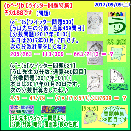 算数・分数[ツイッター問題特集188]算太数子の算数教室 【2017/09/09】算数合格トラの巻 ※─────────────────────────※ 【う山雄一先生・ツイッター問題】まとめ ※─────────────────────────※ 【算数合格トラの巻】 【算太・数子の算数教室】(R) ※─────────────────────────※ (o^-')b 本日は[分数問題]のまとめです♪ ※─────────────────────────※ □ ◆本日の問題◆ 【う山先生・算数ツイッター問題・No530,531】 □ 2017/09/09(土) □ (o^-')b 【ツイッター問題特集】その188です♪ □ (問題) □ 2017/01/17(火) (o^-')b【ツイッター問題530】 [う山先生の分数・通算459問目] [分数問題(2017年-010)] 本日は2017年01月17日です。 次の分数計算をしてね♪ 205/263 - 113/309 - 663/2113 = ? □ □ 2017/01/20(金) (o^-')b【ツイッター問題531】 [う山先生の分数・通算460問目] [分数問題(2017年-011)] 本日は2017年01月20日です。 次の分数計算をしてね♪ 4/5 - 47/79 - (7×17×577)/337609 = ? □ ■ □ [う山先生・ツイッター問題より] [分数・計算・暗号・覆面算・数の性質] □ ※─────────────────────────※ (*^ー^)ノ 「ツイッター問題のまとめ」です☆ □ 【ダンロック】君が言ってますように、 『ツイッター問題特集 188回目です☆』 です。 □ 本日の「抜粋問題」は上記2問です☆(^0^)/ □ [う山先生の分数]を楽しんで解いて、 【分数で算数合格】しましょう☆(o^-')b □ う山先生の予想正答率は、 2問正解 → 15%以下 1問正解 → 30%以下 です。 □ ではレッツ・ゴー!! ☆(^o^)/ □ 答えは、 ↓ ↓ ↓ ↓ ↓ ↓ ↓ ↓ ↓ □ ♪( ´θ`)ノ【ツイッター問題530】解答 [う山先生の分数・通算459問目] [分数問題(2017年-010)] (解法) 205/263 - 113/309 - 663/2113 =133847985/171717171 - 62796247/171717171 - 53880021/171717171 =17171717/171717171 □ 【答え】[17171717/171717171]です。 (分子=17171717→8個) (分母=171717171→9個) (本日1月17日に相応しい、面白い分数を作成しました♪)□ □ ♪( ´θ`)ノ【ツイッター問題531】解答 [う山先生の分数・通算460問目] [分数問題(2017年-011)] (解法) 4/5 - 47/79 - (7×17×577)/337609 =4/5 - 47/79 - 68663/337609 =1xxx-xxx-xxxxx/133355555 - 79338115/133355555 - 27121885/133355555 =224444/133355555 □ 【答え】[224444/133355555]です。 (分子=22+4444) (分母=1+333+55555) (本日は分子が偶数・分母が奇数で、 1が1個・2が2個・3が3個・4が4個・5が5個の面白い分数を作成しました♪) □ □ ※─────────────────────────※ 中学受験算数・数学・算数数学プロ家庭教師・個人指導 ※─────────────────────────※ □□□□□□□□□□□□□□□□□□□□□□□□□□□ [発行者氏名]【う山雄一】 [発行者web]【算数合格トラの巻】 [発行者web]【算太・数子の算数教室】(R) [著作]【算太・数子の算数教室】(R) 「さんた・かずこのさんすうきょうしつ」 [著作]【算遊記】 □ [仕事URL] https://sansu.theblog.me/ http://santakazuko.wix.com/uyama http://www.geocities.jp/sansu_gokaku_toranomaki/ □ [成績表・偏差値アップ] http://www.geocities.jp/santa_kazuko_1994/ □ [算遊記(さんゆうき)]算蔵法師・算悟空 http://www.geocities.jp/san_yu_ki/ □ [仕事用フェイスブック] https://www.facebook.com/kazuko.santa.5 □ [仕事用メール] ??????@hotmail.com ??????@gmail.com □ [ブログ]【算数合格トラの巻】 http://ameblo.jp/sansu/ http://blogs.yahoo.co.jp/sansu_gokaku_toranomaki http://uyama.blog.jp/ □ [ブログ]【算太・数子の算数教室】(R) http://ameblo.jp/santa-kazuko/ http://blogs.yahoo.co.jp/santa_kazuko_1994 http://blog.goo.ne.jp/santa_kazuko http://santakazuko.wordpress.com/ http://santa-kazuko.at.webry.info/ http://santa-kazuko.blogspot.jp/ http://ch.nicovideo.jp/santa-kazuko http://santa-kazuko.blog.jp/ □ [ブログ]【う山先生】 http://happy.ap.teacup.com/uyama/ http://blog.livedoor.jp/sansu/ http://blogs.yahoo.co.jp/san_yu_ki http://sansugokaku.blog.fc2.com/ □ [ブログ]【オルドビスキー博士】 http://ameblo.jp/ordovisky/ □ [動画配信]【う山TV】(スタディ/バラエティ) http://www.geocities.jp/sansu_gokaku_toranomaki/3-uyama-tv [分数、楽しい!]シリーズ [分数で算数・数学の天才になろう♪]シリーズ [知的ゲーム]シリーズ [一瞬で解こう!]シリーズ [解けたら天才♪]シリーズ [家庭教師]シリーズ [算数・面白い問題]シリーズ [算数・数学ファイル/SSファイル]シリーズ □ □□□□□□□□□□□□□□□□□□□□□□□□□□□ ☆ ☆ ☆ ☆ ☆ ☆ ☆