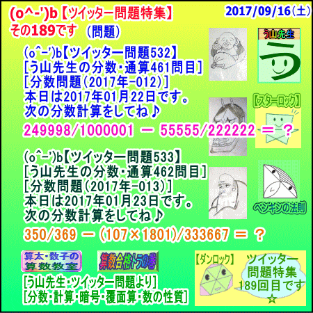 算数・分数[ツイッター問題特集189]算太数子の算数教室 【2017/09/16】算数合格トラの巻 ※─────────────────────────※ 【う山雄一先生・ツイッター問題】まとめ ※─────────────────────────※ 【算数合格トラの巻】 【算太・数子の算数教室】(R) ※─────────────────────────※ (o^-')b 本日は[分数問題]のまとめです♪ ※─────────────────────────※ □ ◆本日の問題◆ 【う山先生・算数ツイッター問題・No532,533】 □ 2017/09/16(土) □ (o^-')b 【ツイッター問題特集】その189です♪ □ (問題) □ 2017/01/22(日) (o^-')b【ツイッター問題532】 [う山先生の分数・通算461問目] [分数問題(2017年-012)] 本日は2017年01月22日です。 次の分数計算をしてね♪ 249998/1000001 - 55555/222222 = ? □ □ 2017/01/23(月) (o^-')b【ツイッター問題533】 [う山先生の分数・通算462問目] [分数問題(2017年-013)] 本日は2017年01月23日です。 次の分数計算をしてね♪ 350/369 - (107×1801)/333667 = ? □ ■ □ [う山先生・ツイッター問題より] [分数・計算・暗号・覆面算・数の性質] □ ※─────────────────────────※ (*^ー^)ノ 「ツイッター問題のまとめ」です☆ □ 【ダンロック】君が言ってますように、 『ツイッター問題特集 189回目です☆』 です。 □ 本日の「抜粋問題」は上記2問です☆(^0^)/ □ [う山先生の分数]を楽しんで解いて、 【分数で算数合格】しましょう☆(o^-')b □ う山先生の予想正答率は、 2問正解 → 15%以下 1問正解 → 30%以下 です。 □ ではレッツ・ゴー!! ☆(^o^)/ □ 答えは、 ↓ ↓ ↓ ↓ ↓ ↓ ↓ ↓ ↓ □ ♪( ´θ`)ノ【ツイッター問題532】解答 [う山先生の分数・通算461問目] [分数問題(2017年-012)] (解法) 249998/1000001 - 55555/222222 =55555055556/222222222222 - 55555055555/222222222222 =1/222222222222 □ 【答え】[1/222222222222]です。 (分子=1) (分母=222222222222→12桁) (本日、1月22日にふさわしい、面白い分数を作成しました♪) □ ♪( ´θ`)ノ【ツイッター問題533】解答 [う山先生の分数・通算462問目] [分数問題(2017年-013)] (解法) 350/369 - (107×1801)/333667 =350/369 - 192707/333667 =116783450/123123123 - 71108883/123123123 =45674567/123123123 □ 【答え】[45674567/123123123]です。 (分子=45674567→8桁) (分母=123123123→9桁) (「123」と「4567」面白く並べた分数を作成しました♪) (本日、1月23日に相応しい分母です) (2016/12/16(金)と同じ答えです。参照して下さい☆) □ □ ※─────────────────────────※ 中学受験算数・数学・算数数学プロ家庭教師・個人指導 ※─────────────────────────※ □□□□□□□□□□□□□□□□□□□□□□□□□□□ [発行者氏名]【う山雄一】 [発行者web]【算数合格トラの巻】 [発行者web]【算太・数子の算数教室】(R) [著作]【算太・数子の算数教室】(R) 「さんた・かずこのさんすうきょうしつ」 [著作]【算遊記】 □ [仕事URL] https://sansu.theblog.me/ http://santakazuko.wix.com/uyama http://www.geocities.jp/sansu_gokaku_toranomaki/ □ [成績表・偏差値アップ] http://www.geocities.jp/santa_kazuko_1994/ □ [算遊記(さんゆうき)]算蔵法師・算悟空 http://www.geocities.jp/san_yu_ki/ □ [仕事用フェイスブック] https://www.facebook.com/kazuko.santa.5 □ [仕事用メール] ??????@hotmail.com ??????@gmail.com □ [ブログ]【算数合格トラの巻】 http://ameblo.jp/sansu/ http://blogs.yahoo.co.jp/sansu_gokaku_toranomaki http://uyama.blog.jp/ □ [ブログ]【算太・数子の算数教室】(R) http://ameblo.jp/santa-kazuko/ http://blogs.yahoo.co.jp/santa_kazuko_1994 http://blog.goo.ne.jp/santa_kazuko http://santakazuko.wordpress.com/ http://santa-kazuko.at.webry.info/ http://santa-kazuko.blogspot.jp/ http://ch.nicovideo.jp/santa-kazuko http://santa-kazuko.blog.jp/ □ [ブログ]【う山先生】 http://happy.ap.teacup.com/uyama/ http://blog.livedoor.jp/sansu/ http://blogs.yahoo.co.jp/san_yu_ki http://sansugokaku.blog.fc2.com/ □ [ブログ]【オルドビスキー博士】 http://ameblo.jp/ordovisky/ □ [動画配信]【う山TV】(スタディ/バラエティ) http://www.geocities.jp/sansu_gokaku_toranomaki/3-uyama-tv [分数、楽しい!]シリーズ [分数で算数・数学の天才になろう♪]シリーズ [知的ゲーム]シリーズ [一瞬で解こう!]シリーズ [解けたら天才♪]シリーズ [家庭教師]シリーズ [算数・面白い問題]シリーズ [算数・数学ファイル/SSファイル]シリーズ □ □□□□□□□□□□□□□□□□□□□□□□□□□□□ ☆ ☆ ☆ ☆ ☆ ☆ ☆