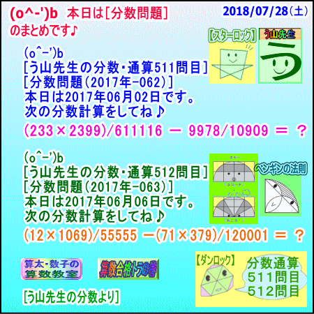 [う山雄一先生の分数]【分数636問目】算数・数学天才問題[2018年7月10日Fraction ※────────────────────※ 【算太・数子の算数教室】(R) 【算数合格トラの巻】 【う山TV(スタディ)】 【う山TV(バラエティ)】 ※────────────────────※ (o^-')b 大人気☆[う山先生式・分数計算]の問題です♪ ※────────────────────※ □ 2018/07/10(火) (o^-')b 【う山先生の分数・通算636問目】 [分数問題(2018年-059)] 本日は2018年7月10日です。 次の分数計算をしてね♪ (131×1973)/(119×4909) -(518×77)/(211×631)= ? □ 【答え】後程♪ □ ※────────────────────※ (*^ー^)ノ[う山先生の分数(2018年-059)]です☆ 本日も面白い分数を作成しました♪ 本日、7月10日にちょっとだけ相応しい 分数問題を作りました。 分子・分母ともどうなるかな♪ ※────────────────────※ [Fraction of Professor Uyama] доля Frakcja Fracao ※────────────────────※ 算数・数学・家庭教師・個別指導・質問教室 ※────────────────────※ □ □□□□□□□□□□□□□□□□□□□□□□ [発行者氏名]【う山雄一】 [発行者web]【算数合格トラの巻】 [発行者web]【算太・数子の算数教室】(R) [著作]【算太・数子の算数教室】(R) 「さんた・かずこのさんすうきょうしつ」 [著作]【算遊記】 □ [メインサイト]う山先生のHP https://uyama.theblog.me/ □ [中学受験・算数]メイン http://www.geocities.jp/sansu_gokaku_toranomaki/ [中学受験・算数]サブ https://sansu.theblog.me/ http://santakazuko.wix.com/uyama □ [成績表・偏差値アップ] http://www.geocities.jp/santa_kazuko_1994/ □ [算遊記(さんゆうき)]算蔵法師・算悟空 http://www.geocities.jp/san_yu_ki/ □ [仕事用フェイスブック] https://www.facebook.com/kazuko.santa.5/ https://www.facebook.com/uyama.sensei/ □ [全般メール] ??????@gmail.com □ [中学受験・仕事用メール] ??????@hotmail.com ??????@gmail.com □ [ブログ]【算数合格トラの巻】 http://ameblo.jp/sansu/ http://blogs.yahoo.co.jp/sansu_gokaku_toranomaki http://uyama.blog.jp/ https://blog.goo.ne.jp/sansu_gokaku □ [ブログ]【算太・数子の算数教室】(R) http://ameblo.jp/santa-kazuko/ http://blogs.yahoo.co.jp/santa_kazuko_1994 http://blog.goo.ne.jp/santa_kazuko http://santakazuko.wordpress.com/ http://santa-kazuko.at.webry.info/ http://santa-kazuko.blogspot.jp/ http://ch.nicovideo.jp/santa-kazuko http://santa-kazuko.blog.jp/ □ [ブログ]【う山先生】 http://happy.ap.teacup.com/uyama/ http://blog.livedoor.jp/sansu/ http://blogs.yahoo.co.jp/san_yu_ki http://sansugokaku.blog.fc2.com/ https://uyama-sensei.hatenablog.com/ □ [ブログ]【オルドビスキー博士】 http://ameblo.jp/ordovisky/ □ [ブログ]【う山TV】 https://ameblo.jp/uyama-tv/ □ [動画配信]【う山TV】(スタディ/バラエティ) http://www.geocities.jp/sansu_gokaku_toranomaki/3-uyama-tv https://uyama-tv.themedia.jp/ □ [分数、楽しい!]シリーズ [分数で算数・数学の天才になろう♪]シリーズ [知的ゲーム]シリーズ [一瞬で解こう!]シリーズ [解けたら天才♪]シリーズ [家庭教師]シリーズ [算数・面白い問題]シリーズ [算数・数学ファイル/SSファイル]シリーズ 【音楽・作曲】シリーズ □ □ [指導日程] https://uyama-yuichi.theblog.me/ □ 【統括ブログ】 https://ameblo.jp/uyama-yuichi/ https://blogs.yahoo.co.jp/uyama_yuichi □ 【お知らせブログ】 https://ameblo.jp/uyama-sensei/ https://blogs.yahoo.co.jp/uyama_sensei https://uyama0515.wordpress.com/ □ 【問題ブログ】 http://www.geocities.jp/sansu_gokaku_toranomaki/2-blog.html □ □□□□□□□□□□□□□□□□□□□□□□ ☆ ☆ ☆ ☆ ☆ ☆ ☆ ☆