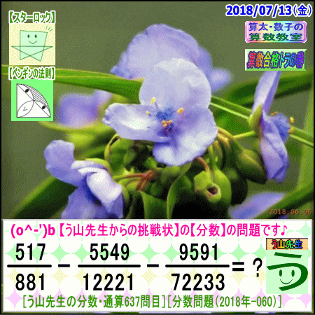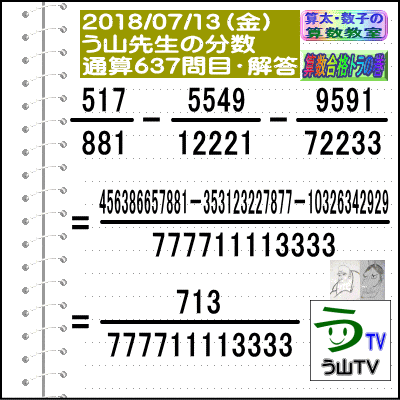 [う山雄一先生の分数]【分数637問目】算数・数学天才問題[2018年7月13日]Fraction □──────────────────□ 【算太・数子の算数教室】(R) 【算数合格トラの巻】 【う山TV(スタディ)】 【う山TV(バラエティ)】 【カンブリア・アカデミー】 ※──────────────────※ (o^-')b 大人気☆[う山先生式・分数計算]の問題です♪ ※──────────────────※ □ 2018/07/13(金) (o^-')b 【う山先生の分数・通算637問目】 [分数問題(2018年-060)] 本日は2018年7月13日です。 次の分数計算をしてね♪ 517/881 - 5549/12221 - 9591/72233 = ? □ 【答え】後程♪ □ ※──────────────────※ (*^ー^)ノ[う山先生の分数(2018年-060)]です☆ 本日も面白い分数を作成しました♪ 本日、7月13日に相応しい分数問題を作りました。 分子・分母ともどうなるかな♪ ※──────────────────※ [Fraction of Professor Uyama] доля Frakcja Fracao ※──────────────────※ 算数・数学・家庭教師・個別指導・質問教室 ※──────────────────※ □ □□□□□□□□□□□□□□□□□□□□ [発行者氏名]【う山雄一】 [発行者web]【算数合格トラの巻】 [発行者web]【算太・数子の算数教室】(R) [著作]【算太・数子の算数教室】(R) 「さんた・かずこのさんすうきょうしつ」 [著作]【算遊記】 □ [メインサイト]う山先生のHP https://uyama.theblog.me/ □ [中学受験・算数]メイン http://www.geocities.jp/sansu_gokaku_toranomaki/ [中学受験・算数]サブ https://sansu.theblog.me/ http://santakazuko.wix.com/uyama □ [成績表・偏差値アップ] http://www.geocities.jp/santa_kazuko_1994/ □ [算遊記(さんゆうき)]算蔵法師・算悟空 http://www.geocities.jp/san_yu_ki/ □ [仕事用フェイスブック] https://www.facebook.com/kazuko.santa.5/ https://www.facebook.com/uyama.sensei/ □ [全般メール] ??????@gmail.com □ [中学受験・仕事用メール] ??????@hotmail.com ??????@gmail.com □ [ブログ]【算数合格トラの巻】 http://ameblo.jp/sansu/ http://blogs.yahoo.co.jp/sansu_gokaku_toranomaki http://uyama.blog.jp/ https://blog.goo.ne.jp/sansu_gokaku □ [ブログ]【算太・数子の算数教室】(R) http://ameblo.jp/santa-kazuko/ http://blogs.yahoo.co.jp/santa_kazuko_1994 http://blog.goo.ne.jp/santa_kazuko http://santakazuko.wordpress.com/ http://santa-kazuko.at.webry.info/ http://santa-kazuko.blogspot.jp/ http://ch.nicovideo.jp/santa-kazuko http://santa-kazuko.blog.jp/ □ [ブログ]【う山先生】 http://happy.ap.teacup.com/uyama/ http://blog.livedoor.jp/sansu/ http://blogs.yahoo.co.jp/san_yu_ki http://sansugokaku.blog.fc2.com/ https://uyama-sensei.hatenablog.com/ □ [ブログ]【オルドビスキー博士】 http://ameblo.jp/ordovisky/ □ [ブログ]【う山TV】 https://ameblo.jp/uyama-tv/ □ [動画配信]【う山TV】(スタディ/バラエティ) http://www.geocities.jp/sansu_gokaku_toranomaki/3-uyama-tv https://uyama-tv.themedia.jp/ □ [分数、楽しい!]シリーズ [分数で算数・数学の天才になろう♪]シリーズ [知的ゲーム]シリーズ [一瞬で解こう!]シリーズ [解けたら天才♪]シリーズ [家庭教師]シリーズ [算数・面白い問題]シリーズ [算数・数学ファイル/SSファイル]シリーズ 【音楽・作曲】シリーズ □ □ [指導日程] https://uyama-yuichi.theblog.me/ □ 【統括ブログ】 https://ameblo.jp/uyama-yuichi/ https://blogs.yahoo.co.jp/uyama_yuichi □ 【お知らせブログ】 https://ameblo.jp/uyama-sensei/ https://blogs.yahoo.co.jp/uyama_sensei https://uyama0515.wordpress.com/ □ 【問題ブログ】 http://www.geocities.jp/sansu_gokaku_toranomaki/2-blog.html □ □□□□□□□□□□□□□□□□□□□□ ☆ ☆ ☆ ☆ ☆ ☆ ☆ ☆