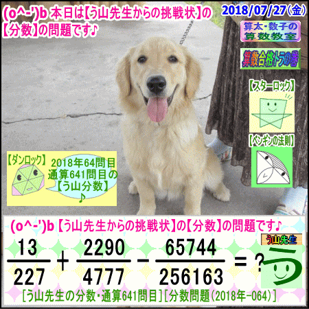 [う山雄一先生の分数]【分数641問目】算数・数学天才問題[2018年7月27日]Fraction □──────────────────□ 【算太・数子の算数教室】(R) 【算数合格トラの巻】 【う山TV(スタディ)】 【う山TV(バラエティ)】 【カンブリア・アカデミー】 ※──────────────────※ (o^-')b 大人気☆[う山先生式・分数計算]の問題です♪ ※──────────────────※ □ 2018/07/27(金) (o^-')b 【う山先生の分数・通算641問目】 [分数問題(2018年-064)] 本日は2018年7月27日です。 次の分数計算をしてね♪ 13/227 + 2290/4777 - 65744/256163 = ? □ 【答え】後程♪ □ ※──────────────────※ (*^ー^)ノ[う山先生の分数(2018年-064)]です☆ 本日、7月27日に相応しい面白い分数を作成しました♪ 分子・分母ともどうなるかな♪ ※──────────────────※ [Fraction of Professor Uyama] доля Frakcja Fracao ※──────────────────※ 算数・数学・家庭教師・個別指導・質問教室 ※──────────────────※ □ □□□□□□□□□□□□□□□□□□□□ [発行者氏名]【う山雄一】 [発行者web]【算数合格トラの巻】 [発行者web]【算太・数子の算数教室】(R) [著作]【算太・数子の算数教室】(R) 「さんた・かずこのさんすうきょうしつ」 [著作]【算遊記】 □ [メインサイト]う山先生のHP https://uyama.theblog.me/ □ [中学受験・算数]メイン http://www.geocities.jp/sansu_gokaku_toranomaki/ [中学受験・算数]サブ https://sansu.theblog.me/ http://santakazuko.wix.com/uyama □ [成績表・偏差値アップ] http://www.geocities.jp/santa_kazuko_1994/ □ [算遊記(さんゆうき)]算蔵法師・算悟空 http://www.geocities.jp/san_yu_ki/ □ [仕事用フェイスブック] https://www.facebook.com/kazuko.santa.5/ https://www.facebook.com/uyama.sensei/ □ [全般メール] ??????@gmail.com □ [中学受験・仕事用メール] ??????@hotmail.com ??????@gmail.com □ [ブログ]【算数合格トラの巻】 http://ameblo.jp/sansu/ http://blogs.yahoo.co.jp/sansu_gokaku_toranomaki http://uyama.blog.jp/ https://blog.goo.ne.jp/sansu_gokaku □ [ブログ]【算太・数子の算数教室】(R) http://ameblo.jp/santa-kazuko/ http://blogs.yahoo.co.jp/santa_kazuko_1994 http://blog.goo.ne.jp/santa_kazuko http://santakazuko.wordpress.com/ http://santa-kazuko.at.webry.info/ http://santa-kazuko.blogspot.jp/ http://ch.nicovideo.jp/santa-kazuko http://santa-kazuko.blog.jp/ □ [ブログ]【う山先生】 http://happy.ap.teacup.com/uyama/ http://blog.livedoor.jp/sansu/ http://blogs.yahoo.co.jp/san_yu_ki http://sansugokaku.blog.fc2.com/ https://uyama-sensei.hatenablog.com/ □ [ブログ]【オルドビスキー博士】 http://ameblo.jp/ordovisky/ □ [ブログ]【う山TV】 https://ameblo.jp/uyama-tv/ □ [動画配信]【う山TV】(スタディ/バラエティ) http://www.geocities.jp/sansu_gokaku_toranomaki/3-uyama-tv https://uyama-tv.themedia.jp/ □ [分数、楽しい!]シリーズ [分数で算数・数学の天才になろう♪]シリーズ [知的ゲーム]シリーズ [一瞬で解こう!]シリーズ [解けたら天才♪]シリーズ [家庭教師]シリーズ [算数・面白い問題]シリーズ [算数・数学ファイル/SSファイル]シリーズ 【音楽・作曲】シリーズ □ □ [指導日程] https://uyama-yuichi.theblog.me/ □ 【統括ブログ】 https://ameblo.jp/uyama-yuichi/ https://blogs.yahoo.co.jp/uyama_yuichi □ 【お知らせブログ】 https://ameblo.jp/uyama-sensei/ https://blogs.yahoo.co.jp/uyama_sensei https://uyama0515.wordpress.com/ □ 【問題ブログ】 http://www.geocities.jp/sansu_gokaku_toranomaki/2-blog.html □ □□□□□□□□□□□□□□□□□□□□ ☆ ☆ ☆ ☆ ☆ ☆ ☆ ☆