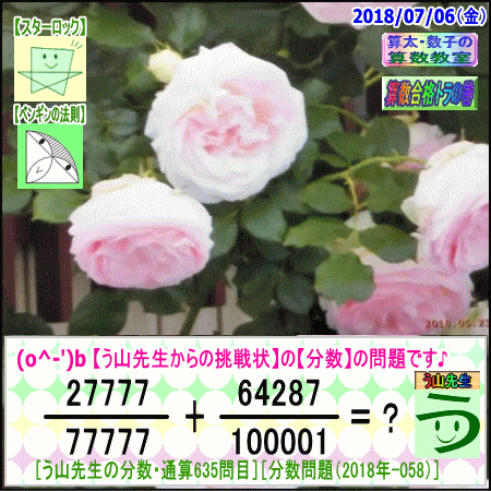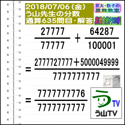 [う山雄一先生の分数]【分数635問目】算数・数学天才問題[2018年7月6日]Fraction ※────────────────────※ 【算太・数子の算数教室】(R) 【算数合格トラの巻】 【う山TV(スタディ)】 【う山TV(バラエティ)】 ※────────────────────※ (o^-')b 大人気☆[う山先生式・分数計算]の問題です♪ ※────────────────────※ □ 2018/07/06(金) (o^-')b 【う山先生の分数・通算635問目】 [分数問題(2018年-058)] 本日は2018年7月6日です。 次の分数計算をしてね♪ 27777/77777 + 64287/100001 = ? □ 【答え】後程♪ □ ※────────────────────※ (*^ー^)ノ[う山先生の分数(2018年-058)]です☆ 本日も面白い分数を作成しました♪ 本日、7月6日に相応しい分数問題を作りました。 分子・分母ともどうなるかな♪ ※────────────────────※ [Fraction of Professor Uyama] доля Frakcja Fracao ※────────────────────※ 算数・数学・家庭教師・個別指導・質問教室 ※────────────────────※ □ □□□□□□□□□□□□□□□□□□□□□□ [発行者氏名]【う山雄一】 [発行者web]【算数合格トラの巻】 [発行者web]【算太・数子の算数教室】(R) [著作]【算太・数子の算数教室】(R) 「さんた・かずこのさんすうきょうしつ」 [著作]【算遊記】 □ [メインサイト]う山先生のHP https://uyama.theblog.me/ □ [中学受験・算数]メイン http://www.geocities.jp/sansu_gokaku_toranomaki/ [中学受験・算数]サブ https://sansu.theblog.me/ http://santakazuko.wix.com/uyama □ [成績表・偏差値アップ] http://www.geocities.jp/santa_kazuko_1994/ □ [算遊記(さんゆうき)]算蔵法師・算悟空 http://www.geocities.jp/san_yu_ki/ □ [仕事用フェイスブック] https://www.facebook.com/kazuko.santa.5/ https://www.facebook.com/uyama.sensei/ □ [全般メール] ??????@gmail.com □ [中学受験・仕事用メール] ??????@hotmail.com ??????@gmail.com □ [ブログ]【算数合格トラの巻】 http://ameblo.jp/sansu/ http://blogs.yahoo.co.jp/sansu_gokaku_toranomaki http://uyama.blog.jp/ https://blog.goo.ne.jp/sansu_gokaku □ [ブログ]【算太・数子の算数教室】(R) http://ameblo.jp/santa-kazuko/ http://blogs.yahoo.co.jp/santa_kazuko_1994 http://blog.goo.ne.jp/santa_kazuko http://santakazuko.wordpress.com/ http://santa-kazuko.at.webry.info/ http://santa-kazuko.blogspot.jp/ http://ch.nicovideo.jp/santa-kazuko http://santa-kazuko.blog.jp/ □ [ブログ]【う山先生】 http://happy.ap.teacup.com/uyama/ http://blog.livedoor.jp/sansu/ http://blogs.yahoo.co.jp/san_yu_ki http://sansugokaku.blog.fc2.com/ https://uyama-sensei.hatenablog.com/ □ [ブログ]【オルドビスキー博士】 http://ameblo.jp/ordovisky/ □ [ブログ]【う山TV】 https://ameblo.jp/uyama-tv/ □ [動画配信]【う山TV】(スタディ/バラエティ) http://www.geocities.jp/sansu_gokaku_toranomaki/3-uyama-tv https://uyama-tv.themedia.jp/ □ [分数、楽しい!]シリーズ [分数で算数・数学の天才になろう♪]シリーズ [知的ゲーム]シリーズ [一瞬で解こう!]シリーズ [解けたら天才♪]シリーズ [家庭教師]シリーズ [算数・面白い問題]シリーズ [算数・数学ファイル/SSファイル]シリーズ 【音楽・作曲】シリーズ □ □ [指導日程] https://uyama-yuichi.theblog.me/ □ 【統括ブログ】 https://ameblo.jp/uyama-yuichi/ https://blogs.yahoo.co.jp/uyama_yuichi □ 【お知らせブログ】 https://ameblo.jp/uyama-sensei/ https://blogs.yahoo.co.jp/uyama_sensei https://uyama0515.wordpress.com/ □ 【問題ブログ】 http://www.geocities.jp/sansu_gokaku_toranomaki/2-blog.html □ □□□□□□□□□□□□□□□□□□□□□□ ☆ ☆ ☆ ☆ ☆ ☆ ☆ ☆