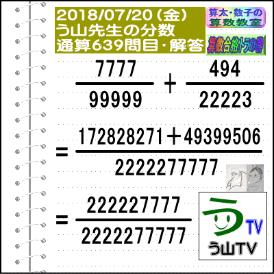 [う山雄一先生の分数]【分数639問目】算数・数学天才問題[2018年7月20日]Fraction □──────────────────□ 【算太・数子の算数教室】(R) 【算数合格トラの巻】 【う山TV(スタディ)】 【う山TV(バラエティ)】 【カンブリア・アカデミー】 ※──────────────────※ (o^-')b 大人気☆[う山先生式・分数計算]の問題です♪ ※──────────────────※ □ 2018/07/20(金) (o^-')b 【う山先生の分数・通算639問目】 [分数問題(2018年-062)] 本日は2018年7月20日です。 次の分数計算をしてね♪ 7777/99999 + 494/22223 = ? □ 【答え】後程♪ □ ※──────────────────※ (*^ー^)ノ[う山先生の分数(2018年-062)]です☆ 本日も面白い分数を作成しました♪ 本日、7月20日にちょっぴり相応しい分数問題を作りました。 分子・分母ともどうなるかな♪ ※──────────────────※ [Fraction of Professor Uyama] доля Frakcja Fracao ※──────────────────※ 算数・数学・家庭教師・個別指導・質問教室 ※──────────────────※ □ □□□□□□□□□□□□□□□□□□□□ [発行者氏名]【う山雄一】 [発行者web]【算数合格トラの巻】 [発行者web]【算太・数子の算数教室】(R) [著作]【算太・数子の算数教室】(R) 「さんた・かずこのさんすうきょうしつ」 [著作]【算遊記】 □ [メインサイト]う山先生のHP https://uyama.theblog.me/ □ [中学受験・算数]メイン http://www.geocities.jp/sansu_gokaku_toranomaki/ [中学受験・算数]サブ https://sansu.theblog.me/ http://santakazuko.wix.com/uyama □ [成績表・偏差値アップ] http://www.geocities.jp/santa_kazuko_1994/ □ [算遊記(さんゆうき)]算蔵法師・算悟空 http://www.geocities.jp/san_yu_ki/ □ [仕事用フェイスブック] https://www.facebook.com/kazuko.santa.5/ https://www.facebook.com/uyama.sensei/ □ [全般メール] ??????@gmail.com □ [中学受験・仕事用メール] ??????@hotmail.com ??????@gmail.com □ [ブログ]【算数合格トラの巻】 http://ameblo.jp/sansu/ http://blogs.yahoo.co.jp/sansu_gokaku_toranomaki http://uyama.blog.jp/ https://blog.goo.ne.jp/sansu_gokaku □ [ブログ]【算太・数子の算数教室】(R) http://ameblo.jp/santa-kazuko/ http://blogs.yahoo.co.jp/santa_kazuko_1994 http://blog.goo.ne.jp/santa_kazuko http://santakazuko.wordpress.com/ http://santa-kazuko.at.webry.info/ http://santa-kazuko.blogspot.jp/ http://ch.nicovideo.jp/santa-kazuko http://santa-kazuko.blog.jp/ □ [ブログ]【う山先生】 http://happy.ap.teacup.com/uyama/ http://blog.livedoor.jp/sansu/ http://blogs.yahoo.co.jp/san_yu_ki http://sansugokaku.blog.fc2.com/ https://uyama-sensei.hatenablog.com/ □ [ブログ]【オルドビスキー博士】 http://ameblo.jp/ordovisky/ □ [ブログ]【う山TV】 https://ameblo.jp/uyama-tv/ □ [動画配信]【う山TV】(スタディ/バラエティ) http://www.geocities.jp/sansu_gokaku_toranomaki/3-uyama-tv https://uyama-tv.themedia.jp/ □ [分数、楽しい!]シリーズ [分数で算数・数学の天才になろう♪]シリーズ [知的ゲーム]シリーズ [一瞬で解こう!]シリーズ [解けたら天才♪]シリーズ [家庭教師]シリーズ [算数・面白い問題]シリーズ [算数・数学ファイル/SSファイル]シリーズ 【音楽・作曲】シリーズ □ □ [指導日程] https://uyama-yuichi.theblog.me/ □ 【統括ブログ】 https://ameblo.jp/uyama-yuichi/ https://blogs.yahoo.co.jp/uyama_yuichi □ 【お知らせブログ】 https://ameblo.jp/uyama-sensei/ https://blogs.yahoo.co.jp/uyama_sensei https://uyama0515.wordpress.com/ □ 【問題ブログ】 http://www.geocities.jp/sansu_gokaku_toranomaki/2-blog.html □ □□□□□□□□□□□□□□□□□□□□ ☆ ☆ ☆ ☆ ☆ ☆ ☆ ☆