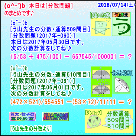 【う山先生の分数のまとめ】[分数問題通算・509問目・510問目](2018/07/14) □──────────────────□ 【う山TV】 【算数合格トラの巻】 【算太・数子の算数教室】(R) 【カンブリア・アカデミー】 □──────────────────□ (o^-')b 本日は[分数問題]のまとめです♪ □──────────────────□ □ ◆本日の問題◆ (o^-')b 【う山先生の分数・No509・No510】です♪ □ 2018/07/14(土) □ (問題) □ □──────────────────□ □ 2017/05/30(火) (o^-')b [う山先生の分数・通算509問目] [分数問題(2017年-060)] 本日は2017年05月30日です。 次の分数計算をしてね♪ 15/53 + 475/1001 - 657545/1000001 = ? □ □──────────────────□ □ 2017/06/01(木) (o^-')b [う山先生の分数・通算510問目] [分数問題(2017年-061)] 本日は2017年06月01日です。 次の分数計算をしてね♪ (472×521)/554551 -(53×72)/11111 = ? □ □──────────────────□ (*^ー^)ノ 【う山先生の分数まとめ】」です☆ □ 【ダンロック】君が言ってますように、 『分数通算 509問目 510問目』 です。 □ 本日の「抜粋問題」は上記2問です☆(^0^)/ □ [う山先生の分数]を楽しんで解いて、 【分数で算数合格】しましょう☆(o^-')b □ う山先生の予想正答率は、 2問正解 → 15%以下 1問正解 → 30%以下 です。 □ ではレッツ・ゴー!! ☆(^o^)/ □ 答えは、 ↓ ↓ ↓ ↓ ↓ ↓ ↓ ↓ ↓ □ □──────────────────□ □ 【解答】 □ ♪( ´θ`)ノ解答 [う山先生の分数・通算509問目] [分数問題(2017年-060)] □ 【答え】[53xxx-xxx-xxxxx/53xxx-xxx-xxxxx]です。 (分子=53xxx-xxx-xxxxx=10桁) (分母=53xxx-xxx-xxxxx=11桁) (本日も、面白い分数を作成しました♪) □ (解法) 15/53 + 475/1001 - 657545/1000001 =15xxx-xxx-xxxxx/53xxx-xxx-xxxxx +25175025175/53xxx-xxx-xxxxx -34884734885/53xxx-xxx-xxxxx =53xxx-xxx-xxxxx/53xxx-xxx-xxxxx □ ※ □ ♪( ´θ`)ノ 本日は、5月30日に相応しい、面白い分数問題を作成しました☆ □ □──────────────────□ □ ♪( ´θ`)ノ解答 [う山先生の分数・通算510問目] [分数問題(2017年-061)] □ 【答え】[616161616/6161616161]です。 (分子=616161616=9桁) (分母=6161616161=10桁) (本日も、面白い分数を作成しました♪) □ (解法) (472×521)/554551 -(53×72)/11111 =245912/554551 - 3816/11111 =2732328232/6161616161 - 2116166616/6161616161 =616161616/6161616161 □ ※ □ ♪( ´θ`)ノ 本日は、6月1日に相応しい、面白い分数問題を作成しました☆ □ □ □──────────────────□ 算数・数学・家庭教師・個別指導・質問教室 □──────────────────□ □□□□□□□□□□□□□□□□□□□□ [氏名]【う山雄一】 [動画]【う山TV(スタディ)】 [動画]【う山TV(バラエティ)】 □ [メインサイト]う山先生のHP https://uyama.theblog.me/ □ □□□□□□□□□□□□□□□□□□□□ ☆ ☆ ☆ ☆ ☆ ☆ ☆ ☆