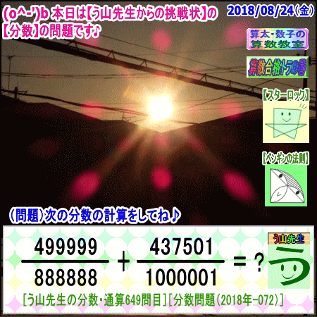 [う山雄一先生の分数]【分数649問目】算数・数学天才問題[2018年8月24日]Fraction □──────────────────□ 【算太・数子の算数教室】(R) 【算数合格トラの巻】 【う山TV(スタディ)】 【う山TV(バラエティ)】 【カンブリア・アカデミー】 ※──────────────────※ (o^-')b 大人気☆[う山先生式・分数計算]の問題です♪ ※──────────────────※ □ 2018/08/24(金) (o^-')b 【う山先生の分数・通算649問目】 [分数問題(2018年-072)] 本日は2018年8月24日です。 次の分数計算をしてね♪ 499999/888888 + 437501/1000001 = ? □ 【答え】後程♪ □ ※──────────────────※ (*^ー^)ノ[う山先生の分数(2018年-072)]です☆ 本日は、8月に相応しい面白い分数を作成しました♪ 分子・分母ともどうなるかな♪ ※──────────────────※ [Fraction of Professor Uyama] доля Frakcja Fracao ※──────────────────※ 算数・数学・家庭教師・個別指導・質問教室 ※──────────────────※ □ □□□□□□□□□□□□□□□□□□□□ [発行者氏名]【う山雄一】 [発行者web]【算数合格トラの巻】 [発行者web]【算太・数子の算数教室】(R) [著作]【算太・数子の算数教室】(R) 「さんた・かずこのさんすうきょうしつ」 [著作]【算遊記】 □ [メインサイト]う山先生のHP https://uyama.theblog.me/ □ [中学受験・算数]メイン http://www.geocities.jp/sansu_gokaku_toranomaki/ [中学受験・算数]サブ https://sansu.theblog.me/ http://santakazuko.wix.com/uyama □ [成績表・偏差値アップ] http://www.geocities.jp/santa_kazuko_1994/ □ [算遊記(さんゆうき)]算蔵法師・算悟空 http://www.geocities.jp/san_yu_ki/ □ [仕事用フェイスブック] https://www.facebook.com/kazuko.santa.5/ https://www.facebook.com/uyama.sensei/ □ [全般メール] ??????@gmail.com □ [中学受験・仕事用メール] ??????@hotmail.com ??????@gmail.com □ [ブログ]【算数合格トラの巻】 http://ameblo.jp/sansu/ http://blogs.yahoo.co.jp/sansu_gokaku_toranomaki http://uyama.blog.jp/ https://blog.goo.ne.jp/sansu_gokaku □ [ブログ]【算太・数子の算数教室】(R) http://ameblo.jp/santa-kazuko/ http://blogs.yahoo.co.jp/santa_kazuko_1994 http://blog.goo.ne.jp/santa_kazuko http://santakazuko.wordpress.com/ http://santa-kazuko.at.webry.info/ http://santa-kazuko.blogspot.jp/ http://ch.nicovideo.jp/santa-kazuko http://santa-kazuko.blog.jp/ □ [ブログ]【う山先生】 http://happy.ap.teacup.com/uyama/ http://blog.livedoor.jp/sansu/ http://blogs.yahoo.co.jp/san_yu_ki http://sansugokaku.blog.fc2.com/ https://uyama-sensei.hatenablog.com/ □ [ブログ]【オルドビスキー博士】 http://ameblo.jp/ordovisky/ □ [ブログ]【う山TV】 https://ameblo.jp/uyama-tv/ □ [動画配信]【う山TV】(スタディ/バラエティ) http://www.geocities.jp/sansu_gokaku_toranomaki/3-uyama-tv https://uyama-tv.themedia.jp/ □ [分数、楽しい!]シリーズ [分数で算数・数学の天才になろう♪]シリーズ [知的ゲーム]シリーズ [一瞬で解こう!]シリーズ [解けたら天才♪]シリーズ [家庭教師]シリーズ [算数・面白い問題]シリーズ [算数・数学ファイル/SSファイル]シリーズ 【音楽・作曲】シリーズ 【空耳】シリーズ □ □ [指導日程] https://uyama-yuichi.theblog.me/ □ 【統括ブログ】 https://ameblo.jp/uyama-yuichi/ https://blogs.yahoo.co.jp/uyama_yuichi □ 【お知らせブログ】 https://ameblo.jp/uyama-sensei/ https://blogs.yahoo.co.jp/uyama_sensei https://uyama0515.wordpress.com/ □ 【毎日の問題ブログ】一覧(お好きなブログを登録してね♪) http://www.geocities.jp/sansu_gokaku_toranomaki/2-blog.html □ □□□□□□□□□□□□□□□□□□□□ ☆ ☆ ☆ ☆ ☆ ☆ ☆ ☆