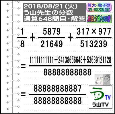 [う山雄一先生の分数]【分数648問目】算数・数学天才問題[2018年8月21日]Fraction □──────────────────□ 【算太・数子の算数教室】(R) 【算数合格トラの巻】 【う山TV(スタディ)】 【う山TV(バラエティ)】 【カンブリア・アカデミー】 ※──────────────────※ (o^-')b 大人気☆[う山先生式・分数計算]の問題です♪ ※──────────────────※ □ 2018/08/21(火) (o^-')b 【う山先生の分数・通算648問目】 [分数問題(2018年-071)] 本日は2018年8月21日です。 次の分数計算をしてね♪ 1/8 + 5879/21649 +(317×977)/513239 = ? □ 【答え】後程♪ □ ※──────────────────※ (*^ー^)ノ[う山先生の分数(2018年-071)]です☆ 本日は、8月に相応しい面白い分数を作成しました♪ 分子・分母ともどうなるかな♪ ※──────────────────※ [Fraction of Professor Uyama] доля Frakcja Fracao ※──────────────────※ 算数・数学・家庭教師・個別指導・質問教室 ※──────────────────※ □ □□□□□□□□□□□□□□□□□□□□ [発行者氏名]【う山雄一】 [発行者web]【算数合格トラの巻】 [発行者web]【算太・数子の算数教室】(R) [著作]【算太・数子の算数教室】(R) 「さんた・かずこのさんすうきょうしつ」 [著作]【算遊記】 □ [メインサイト]う山先生のHP https://uyama.theblog.me/ □ [中学受験・算数]メイン http://www.geocities.jp/sansu_gokaku_toranomaki/ [中学受験・算数]サブ https://sansu.theblog.me/ http://santakazuko.wix.com/uyama □ [成績表・偏差値アップ] http://www.geocities.jp/santa_kazuko_1994/ □ [算遊記(さんゆうき)]算蔵法師・算悟空 http://www.geocities.jp/san_yu_ki/ □ [仕事用フェイスブック] https://www.facebook.com/kazuko.santa.5/ https://www.facebook.com/uyama.sensei/ □ [全般メール] ??????@gmail.com □ [中学受験・仕事用メール] ??????@hotmail.com ??????@gmail.com □ [ブログ]【算数合格トラの巻】 http://ameblo.jp/sansu/ http://blogs.yahoo.co.jp/sansu_gokaku_toranomaki http://uyama.blog.jp/ https://blog.goo.ne.jp/sansu_gokaku □ [ブログ]【算太・数子の算数教室】(R) http://ameblo.jp/santa-kazuko/ http://blogs.yahoo.co.jp/santa_kazuko_1994 http://blog.goo.ne.jp/santa_kazuko http://santakazuko.wordpress.com/ http://santa-kazuko.at.webry.info/ http://santa-kazuko.blogspot.jp/ http://ch.nicovideo.jp/santa-kazuko http://santa-kazuko.blog.jp/ □ [ブログ]【う山先生】 http://happy.ap.teacup.com/uyama/ http://blog.livedoor.jp/sansu/ http://blogs.yahoo.co.jp/san_yu_ki http://sansugokaku.blog.fc2.com/ https://uyama-sensei.hatenablog.com/ □ [ブログ]【オルドビスキー博士】 http://ameblo.jp/ordovisky/ □ [ブログ]【う山TV】 https://ameblo.jp/uyama-tv/ □ [動画配信]【う山TV】(スタディ/バラエティ) http://www.geocities.jp/sansu_gokaku_toranomaki/3-uyama-tv https://uyama-tv.themedia.jp/ □ [分数、楽しい!]シリーズ [分数で算数・数学の天才になろう♪]シリーズ [知的ゲーム]シリーズ [一瞬で解こう!]シリーズ [解けたら天才♪]シリーズ [家庭教師]シリーズ [算数・面白い問題]シリーズ [算数・数学ファイル/SSファイル]シリーズ 【音楽・作曲】シリーズ 【空耳】シリーズ □ □ [指導日程] https://uyama-yuichi.theblog.me/ □ 【統括ブログ】 https://ameblo.jp/uyama-yuichi/ https://blogs.yahoo.co.jp/uyama_yuichi □ 【お知らせブログ】 https://ameblo.jp/uyama-sensei/ https://blogs.yahoo.co.jp/uyama_sensei https://uyama0515.wordpress.com/ □ 【毎日の問題ブログ】一覧(お好きなブログを登録してね♪) http://www.geocities.jp/sansu_gokaku_toranomaki/2-blog.html □ □□□□□□□□□□□□□□□□□□□□ ☆ ☆ ☆ ☆ ☆ ☆ ☆ ☆