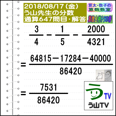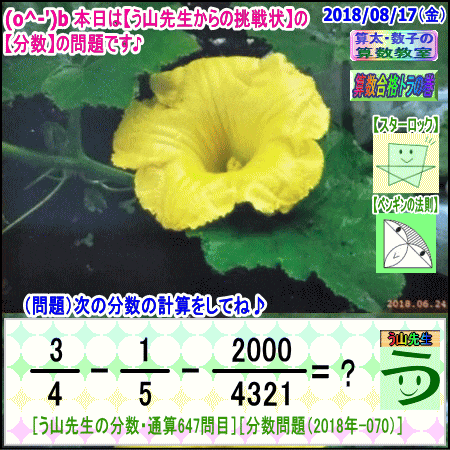 [う山雄一先生の分数]【分数647問目】算数・数学天才問題[2018年8月17日]Fraction □──────────────────□ 【算太・数子の算数教室】(R) 【算数合格トラの巻】 【う山TV(スタディ)】 【う山TV(バラエティ)】 【カンブリア・アカデミー】 ※──────────────────※ (o^-')b 大人気☆[う山先生式・分数計算]の問題です♪ ※──────────────────※ □ 2018/08/17(金) (o^-')b 【う山先生の分数・通算647問目】 [分数問題(2018年-070)] 本日は2018年8月17日です。 次の分数計算をしてね♪ 3/4 - 1/5 - 2000/4321 = ? □ 【答え】後程♪ □ ※──────────────────※ (*^ー^)ノ[う山先生の分数(2018年-070)]です☆ 本日は、8月に相応しい面白い分数を作成しました♪ 分子・分母ともどうなるかな♪ ※──────────────────※ [Fraction of Professor Uyama] доля Frakcja Fracao ※──────────────────※ 算数・数学・家庭教師・個別指導・質問教室 ※──────────────────※ □ □□□□□□□□□□□□□□□□□□□□ [発行者氏名]【う山雄一】 [発行者web]【算数合格トラの巻】 [発行者web]【算太・数子の算数教室】(R) [著作]【算太・数子の算数教室】(R) 「さんた・かずこのさんすうきょうしつ」 [著作]【算遊記】 □ [メインサイト]う山先生のHP https://uyama.theblog.me/ □ [中学受験・算数]メイン http://www.geocities.jp/sansu_gokaku_toranomaki/ [中学受験・算数]サブ https://sansu.theblog.me/ http://santakazuko.wix.com/uyama □ [成績表・偏差値アップ] http://www.geocities.jp/santa_kazuko_1994/ □ [算遊記(さんゆうき)]算蔵法師・算悟空 http://www.geocities.jp/san_yu_ki/ □ [仕事用フェイスブック] https://www.facebook.com/kazuko.santa.5/ https://www.facebook.com/uyama.sensei/ □ [全般メール] ??????@gmail.com □ [中学受験・仕事用メール] ??????@hotmail.com ??????@gmail.com □ [ブログ]【算数合格トラの巻】 http://ameblo.jp/sansu/ http://blogs.yahoo.co.jp/sansu_gokaku_toranomaki http://uyama.blog.jp/ https://blog.goo.ne.jp/sansu_gokaku □ [ブログ]【算太・数子の算数教室】(R) http://ameblo.jp/santa-kazuko/ http://blogs.yahoo.co.jp/santa_kazuko_1994 http://blog.goo.ne.jp/santa_kazuko http://santakazuko.wordpress.com/ http://santa-kazuko.at.webry.info/ http://santa-kazuko.blogspot.jp/ http://ch.nicovideo.jp/santa-kazuko http://santa-kazuko.blog.jp/ □ [ブログ]【う山先生】 http://happy.ap.teacup.com/uyama/ http://blog.livedoor.jp/sansu/ http://blogs.yahoo.co.jp/san_yu_ki http://sansugokaku.blog.fc2.com/ https://uyama-sensei.hatenablog.com/ □ [ブログ]【オルドビスキー博士】 http://ameblo.jp/ordovisky/ □ [ブログ]【う山TV】 https://ameblo.jp/uyama-tv/ □ [動画配信]【う山TV】(スタディ/バラエティ) http://www.geocities.jp/sansu_gokaku_toranomaki/3-uyama-tv https://uyama-tv.themedia.jp/ □ [分数、楽しい!]シリーズ [分数で算数・数学の天才になろう♪]シリーズ [知的ゲーム]シリーズ [一瞬で解こう!]シリーズ [解けたら天才♪]シリーズ [家庭教師]シリーズ [算数・面白い問題]シリーズ [算数・数学ファイル/SSファイル]シリーズ 【音楽・作曲】シリーズ 【空耳】シリーズ □ □ [指導日程] https://uyama-yuichi.theblog.me/ □ 【統括ブログ】 https://ameblo.jp/uyama-yuichi/ https://blogs.yahoo.co.jp/uyama_yuichi □ 【お知らせブログ】 https://ameblo.jp/uyama-sensei/ https://blogs.yahoo.co.jp/uyama_sensei https://uyama0515.wordpress.com/ □ 【毎日の問題ブログ】一覧(お好きなブログを登録してね♪) http://www.geocities.jp/sansu_gokaku_toranomaki/2-blog.html □ □□□□□□□□□□□□□□□□□□□□ ☆ ☆ ☆ ☆ ☆ ☆ ☆ ☆