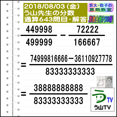 [う山先生・分数]【算数・数学】【う山先生からの挑戦状】分数643問目[Fraction] □──────────────────□ (o^-')b【算数合格トラの巻】 【算太・数子の算数教室】(R) 【う山TV】 【カンブリア・アカデミー】 [Fraction of Professor Uyama] □──────────────────□ □ 2018/08/03(金) □ (o^-')b 本日は【う山先生からの挑戦状】の、 【分数】の問題です♪ □ (問題) 次の分数の計算をしてね♪ □ 449998/499999 - 72222/166667 = ? □ [う山先生の分数・通算643問目] [分数問題(2018年-066)] □ □──────────────────□ □ (*^ー^)ノ 今回も、4年生・5年生でも、 頑張れば、楽しく解ける分数問題です☆ [う山先生の分数]は、 昨年2017年までは、 合計「577問」作りました☆ 今年も、わかりやすく通し番号(通算番号)と、 その年の作成番号でいきます♪ □ 【ダンロック】君が言ってますように、 『2018年66問目 通算643問目の 【う山分数】♪』 です。 □ 本日も人気の【う山雄一先生の分数問題】です! 楽しく解いてみて下さい♪(^^) □ [YouTube]の【う山TV】の分数動画も参照してね☆ □ 本日も、面白い分数問題を作成しました! 分母・分子はどうなるかな? 頑張って、10分以内で正解して下さい。 『算数は面白い!』を実感してね♪(^0^)/ □ [計算問題]を楽しんで解いて、 【算数は面白い!で算数合格】しましょう☆(o^-')b □ う山先生の予想正答率は、 堂々と正解 → 3.8%以下 頑張って正解 → 8.3%以下 頑張ったけど惜しくも不正解 → 38%以下 約分可能かどうか悩んで不正解 → 8.3%以下 です。 □ ではレッツ・ゴー!! ☆(^o^)/ □ 答えは、 ↓ ↓ ↓ ↓ ↓ ↓ ↓ ↓ ↓ □ 【答え】[38888888888/83333333333]です。 (分子=38888888888=3が1個+8が10個→11桁) (分母=83333333333=8が1個+3が10個→11桁) (本日も面白い分数問題を作りました☆) □ (*^ー^)ノ 分母の[499999]、[166667]、は「互いに素」です☆ (499999=31×127×127) (166667=素数) なので、 最小公倍数は、 (83333333333[11桁]=166667×499999) です。 (分母は、面白い並びですよね♪) (さて、分子はどうなるかな?) □ よって、 □ (解法) 449998/499999 - 72222/166667 =74999816666/83333333333 - 3611xxx-xxx-xxxxx/83333333333 =38888888888/83333333333 です。 □ ♪( ´θ`)ノ 本日も面白い数字の分数を作成しました♪ 本日、8月3日に相応しい、 [8・3問題の分数]です☆ □ (o^-')b 分子は[38888888888→11桁]で、 分母は[83333333333→11桁]です☆ □ ♪( ´θ`)ノ さらに、上下が反転してる点も味わって下さい♪ □ □ ☆(o^-')b もちろん、答えは既約分数です。 □ (*^ー^)ノ[参考] (499999=31×127×127) (166667=素数) (449998=2×71×3169) (72222=2×3×12037) (38888888888[11桁]=2×2×2×23×211352657) (83333333333[11桁]=31×127×127×166667=166667×499999) □ □ □□□□□□□□ [参考] 【う山先生の分数】通算643問目 [2013年]40問 [2014年]135問 [2015年]143問 [2016年]131問 [2017年]128問 [2018年] 2018/01/01(月)[1/2018](お正月用問題1) 2018/01/01(月)[1/2018](お正月用問題2) 2018/01/02(火)[1/2018](お正月用問題3) 2018/01/02(火)[1/2018](お正月用問題4) 2018/01/03(水)[3/2018] 2018/01/05(金)[5/2018] 2018/01/09(火)[9/2018] 2018/01/12(金)[123456788/123456789] 2018/01/16(火)[2017/2018] 2018/01/19(金)[19191919/191919191] □ 2018/01/23(火)[1111111/1233333321](初形) 2018/01/26(金)[2017/2018] 2018/01/30(火)[1xxx-xxx-xxxxx/3xxx-xxx-xxxxx](初形) 2018/02/02(金)[22222222222/123456654321](初形) 2018/02/06(火)[1111111115/2222222226](初形) 2018/02/09(金)[22222922222/99999299999] 2018/02/13(火)[11111222222/11111333333] 2018/02/16(金)[11111555555/11111666666] 2018/02/20(火)[1xxx-xxx-xxxxx/22xxx-xxx-xxxxx] 2018/02/23(金)[3456789/22222222] □ 2018/02/27(火)[22777777/227777777] 2018/03/02(金)[244466666/355577777] 2018/03/06(火)[2255555/333666666](600問目) 2018/03/09(金)[28888888888/39999999999](初形) 2018/03/13(火)[11311311311/33133133133] 2018/03/16(金)[44446666/3333355555](初形) 2018/03/20(火)[11122322111/33322122333] 2018/03/23(金)[32323232323/323232323232](初形) 2018/03/27(火)[333/227777777] 2018/03/30(金)[11111111111/333444555666] □ 2018/04/03(火)[333333333/4444444444](初形) 2018/04/06(金)[55555/4444446666] 2018/04/10(火)[11111144444/44444411111] 2018/04/13(金)[123454321/444444444444] 2018/04/17(火)[1234444444/4444444321] 2018/04/20(金)[33333311111/44444422222](初形) 2018/04/24(火)[31313131313/42424242424] 2018/04/27(金)[1/44444844444] 2018/05/01(火)[555551111/5555511111](初形) 2018/05/04(金)[5/12346789] □ 2018/05/08(火)[55555558888/88888885555](初形) 2018/05/11(金)[11111111111/555555555555] 2018/05/15(火)[4444333/66666655555] 2018/05/18(金)[555544433/555554444333] 2018/05/22(火)[444/12344321](初形) 2018/05/25(金)[5555555552/22222222225](初形) 2018/05/29(火)[12346789/55555555](初形) 2018/06/01(金)[55555355555/66666466666](初形) 2018/06/05(火)[55555566666/66666655555] 2018/06/08(金)[7777777/6666688888] □ 2018/06/12(火)[44443333/6666655555] 2018/06/15(金)[55555333/6666664444] 2018/06/19(火)[55555333/6666664444] 2018/06/22(金)[333666666/444455555] 2018/06/26(火)[55555333/4444446666] 2018/06/29(金)[555554444/666666333] 2018/07/03(火)[3333333777/7777777333] 2018/07/06(金)[7777777776/7777777777] 2018/07/10(火)[11111777777/77777111111] 2018/07/13(金)[713/777711113333] □ 2018/07/17(火)[71717171717/717171717171] 2018/07/20(金)[222227777/2222277777] 2018/07/24(火)[123456/77777777] 2018/07/27(金)[77777777777/277777777777] 2018/07/31(火)[123456/7777777777] 2018/08/0