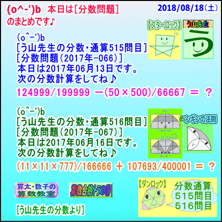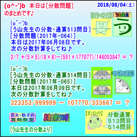 [う山雄一先生の分数]【分数645問目】算数・数学天才問題[2018年8月10日]Fraction □──────────────────□ 【算太・数子の算数教室】(R) 【算数合格トラの巻】 【う山TV(スタディ)】 【う山TV(バラエティ)】 【カンブリア・アカデミー】 ※──────────────────※ (o^-')b 大人気☆[う山先生式・分数計算]の問題です♪ ※──────────────────※ □ 2018/08/10(金) (o^-')b 【う山先生の分数・通算645問目】 [分数問題(2018年-068)] 本日は2018年8月10日です。 次の分数計算をしてね♪ (113×115)/89991 - 40007/900991 = ? □ 【答え】後程♪ □ ※──────────────────※ (*^ー^)ノ[う山先生の分数(2018年-068)]です☆ 本日、8月10日に相応しい面白い分数を作成しました♪ 分子・分母ともどうなるかな♪ ※──────────────────※ [Fraction of Professor Uyama] доля Frakcja Fracao ※──────────────────※ 算数・数学・家庭教師・個別指導・質問教室 ※──────────────────※ □ □□□□□□□□□□□□□□□□□□□□ [発行者氏名]【う山雄一】 [発行者web]【算数合格トラの巻】 [発行者web]【算太・数子の算数教室】(R) [著作]【算太・数子の算数教室】(R) 「さんた・かずこのさんすうきょうしつ」 [著作]【算遊記】 □ [メインサイト]う山先生のHP https://uyama.theblog.me/ □ [中学受験・算数]メイン http://www.geocities.jp/sansu_gokaku_toranomaki/ [中学受験・算数]サブ https://sansu.theblog.me/ http://santakazuko.wix.com/uyama □ [成績表・偏差値アップ] http://www.geocities.jp/santa_kazuko_1994/ □ [算遊記(さんゆうき)]算蔵法師・算悟空 http://www.geocities.jp/san_yu_ki/ □ [仕事用フェイスブック] https://www.facebook.com/kazuko.santa.5/ https://www.facebook.com/uyama.sensei/ □ [全般メール] ??????@gmail.com □ [中学受験・仕事用メール] ??????@hotmail.com ??????@gmail.com □ [ブログ]【算数合格トラの巻】 http://ameblo.jp/sansu/ http://blogs.yahoo.co.jp/sansu_gokaku_toranomaki http://uyama.blog.jp/ https://blog.goo.ne.jp/sansu_gokaku □ [ブログ]【算太・数子の算数教室】(R) http://ameblo.jp/santa-kazuko/ http://blogs.yahoo.co.jp/santa_kazuko_1994 http://blog.goo.ne.jp/santa_kazuko http://santakazuko.wordpress.com/ http://santa-kazuko.at.webry.info/ http://santa-kazuko.blogspot.jp/ http://ch.nicovideo.jp/santa-kazuko http://santa-kazuko.blog.jp/ □ [ブログ]【う山先生】 http://happy.ap.teacup.com/uyama/ http://blog.livedoor.jp/sansu/ http://blogs.yahoo.co.jp/san_yu_ki http://sansugokaku.blog.fc2.com/ https://uyama-sensei.hatenablog.com/ □ [ブログ]【オルドビスキー博士】 http://ameblo.jp/ordovisky/ □ [ブログ]【う山TV】 https://ameblo.jp/uyama-tv/ □ [動画配信]【う山TV】(スタディ/バラエティ) http://www.geocities.jp/sansu_gokaku_toranomaki/3-uyama-tv https://uyama-tv.themedia.jp/ □ [分数、楽しい!]シリーズ [分数で算数・数学の天才になろう♪]シリーズ [知的ゲーム]シリーズ [一瞬で解こう!]シリーズ [解けたら天才♪]シリーズ [家庭教師]シリーズ [算数・面白い問題]シリーズ [算数・数学ファイル/SSファイル]シリーズ 【音楽・作曲】シリーズ □ □ [指導日程] https://uyama-yuichi.theblog.me/ □ 【統括ブログ】 https://ameblo.jp/uyama-yuichi/ https://blogs.yahoo.co.jp/uyama_yuichi □ 【お知らせブログ】 https://ameblo.jp/uyama-sensei/ https://blogs.yahoo.co.jp/uyama_sensei https://uyama0515.wordpress.com/ □ 【毎日の問題ブログ】一覧(お好きなブログを登録してね♪) http://www.geocities.jp/sansu_gokaku_toranomaki/2-blog.html □ □□□□□□□□□□□□□□□□□□□□ ☆ ☆ ☆ ☆ ☆ ☆ ☆ ☆
