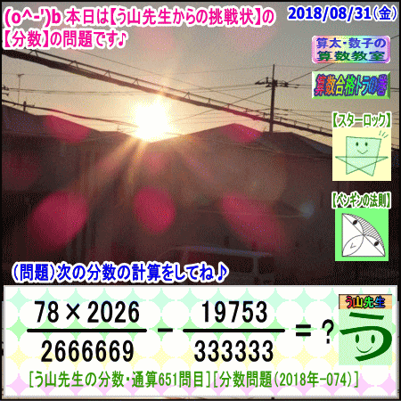 [う山雄一先生の分数]【分数651問目】算数・数学天才問題[2018年8月31日]Fraction □──────────────────□ 【算太・数子の算数教室】(R) 【算数合格トラの巻】 【う山TV(スタディ)】 【う山TV(バラエティ)】 【カンブリア・アカデミー】 ※──────────────────※ (o^-')b 大人気☆[う山先生式・分数計算]の問題です♪ ※──────────────────※ □ 2018/08/31(金) (o^-')b 【う山先生の分数・通算651問目】 [分数問題(2018年-074)] 本日は2018年8月31日です。 次の分数計算をしてね♪ (78×2026)/2666669 - 19753/333333 = ? □ 【答え】後程♪ □ ※──────────────────※ (*^ー^)ノ[う山先生の分数(2018年-074)]です☆ 本日は、8月に相応しい面白い分数を作成しました♪ 分子・分母ともどうなるかな♪ ※──────────────────※ [Fraction of Professor Uyama] доля Frakcja Fracao ※──────────────────※ 算数・数学・家庭教師・個別指導・質問教室 ※──────────────────※ □ □□□□□□□□□□□□□□□□□□□□ [発行者氏名]【う山雄一】 [発行者web]【算数合格トラの巻】 [発行者web]【算太・数子の算数教室】(R) [著作]【算太・数子の算数教室】(R) 「さんた・かずこのさんすうきょうしつ」 [著作]【算遊記】 □ [メインサイト]う山先生のHP https://uyama.theblog.me/ □ [中学受験・算数]メイン http://www.geocities.jp/sansu_gokaku_toranomaki/ [中学受験・算数]サブ https://sansu.theblog.me/ http://santakazuko.wix.com/uyama □ [成績表・偏差値アップ] http://www.geocities.jp/santa_kazuko_1994/ □ [算遊記(さんゆうき)]算蔵法師・算悟空 http://www.geocities.jp/san_yu_ki/ □ [仕事用フェイスブック] https://www.facebook.com/kazuko.santa.5/ □ [全般メール] ??????@gmail.com □ [中学受験・仕事用メール] ??????@hotmail.com ??????@gmail.com □ [ブログ]【算数合格トラの巻】 http://ameblo.jp/sansu/ http://blogs.yahoo.co.jp/sansu_gokaku_toranomaki http://uyama.blog.jp/ https://blog.goo.ne.jp/sansu_gokaku □ [ブログ]【算太・数子の算数教室】(R) http://ameblo.jp/santa-kazuko/ http://blogs.yahoo.co.jp/santa_kazuko_1994 http://blog.goo.ne.jp/santa_kazuko http://santakazuko.wordpress.com/ http://santa-kazuko.at.webry.info/ http://santa-kazuko.blogspot.jp/ http://ch.nicovideo.jp/santa-kazuko http://santa-kazuko.blog.jp/ □ [ブログ]【う山先生】 http://happy.ap.teacup.com/uyama/ http://blog.livedoor.jp/sansu/ http://blogs.yahoo.co.jp/san_yu_ki http://sansugokaku.blog.fc2.com/ https://uyama-sensei.hatenablog.com/ □ [ブログ]【オルドビスキー博士】 http://ameblo.jp/ordovisky/ □ [ブログ]【う山TV】 https://ameblo.jp/uyama-tv/ □ [動画配信]【う山TV】(スタディ/バラエティ) http://www.geocities.jp/sansu_gokaku_toranomaki/3-uyama-tv https://uyama-tv.themedia.jp/ □ [分数、楽しい!]シリーズ [分数で算数・数学の天才になろう♪]シリーズ [知的ゲーム]シリーズ [一瞬で解こう!]シリーズ [解けたら天才♪]シリーズ [家庭教師]シリーズ [算数・面白い問題]シリーズ [算数・数学ファイル/SSファイル]シリーズ 【音楽・作曲】シリーズ 【空耳】シリーズ □ □ [指導日程] https://uyama-yuichi.theblog.me/ □ 【統括ブログ】 https://ameblo.jp/uyama-yuichi/ https://blogs.yahoo.co.jp/uyama_yuichi □ 【お知らせブログ】 https://ameblo.jp/uyama-sensei/ https://blogs.yahoo.co.jp/uyama_sensei https://uyama0515.wordpress.com/ □ 【毎日の問題ブログ】一覧(お好きなブログを登録してね♪) http://www.geocities.jp/sansu_gokaku_toranomaki/2-blog.html □ □□□□□□□□□□□□□□□□□□□□ ☆ ☆ ☆ ☆ ☆ ☆ ☆ ☆