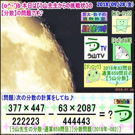 【う山先生のブログ】[1週間の画像まとめ]【2018年9月28日~9月30日】 ※──────────────────※ 【う山TV】 【算数合格トラの巻】 【算太・数子の算数教室】(R) □──────────────────□ □ □──────────────────□ ♪( ´θ`)ノ☆ □──────────────────□ □算数・数学・家庭教師・個別指導・質問教室 □──────────────────□ □ □□□□□□□□□□□□□□□□□□□□ [氏名]【う山雄一】 [動画]【う山TV(スタディ)】 [動画]【う山TV(バラエティ)】 [HP]【算数合格トラの巻】 [著作]【算太・数子の算数教室】(R) 算太君・数子ちゃん [著作]【算遊記(さんゆうき)】算蔵法師・算悟空 □ [メインサイト]【う山先生のHP】 https://uyama.theblog.me/ □ [中学受験]メイン http://www.geocities.jp/sansu_gokaku_toranomaki/ [仕事URL]サブ https://sansu.theblog.me/ http://santakazuko.wix.com/uyama □ [成績表・偏差値アップ] http://www.geocities.jp/santa_kazuko_1994/ □ [動画配信]【う山TV】(スタディ/バラエティ) http://www.geocities.jp/sansu_gokaku_toranomaki/3-uyama-tv https://uyama-tv.themedia.jp/ □ □ [指導日程] https://uyama-yuichi.theblog.me/ □ 【統括ブログ】 https://ameblo.jp/uyama-yuichi/ https://blogs.yahoo.co.jp/uyama_yuichi □ 【お知らせブログ】 https://ameblo.jp/uyama-sensei/ https://blogs.yahoo.co.jp/uyama_sensei https://uyama0515.wordpress.com/ □ □ □□□□□□□□□□□□□□□□□□□□ ☆ ☆ ☆ ☆ ☆ ☆ ☆ ☆