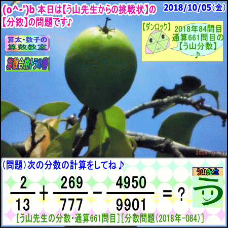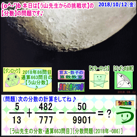 【う山先生のブログ】[1週間の画像まとめ]【2018年10月08日~10月11日】 ※──────────────────※ 【う山TV】 【算数合格トラの巻】 【算太・数子の算数教室】(R) □──────────────────□ □ □──────────────────□ ♪( ´θ`)ノ☆ □──────────────────□ □算数・数学・家庭教師・個別指導・質問教室 □──────────────────□ □ □□□□□□□□□□□□□□□□□□□□ [氏名]【う山雄一】 [動画]【う山TV(スタディ)】 [動画]【う山TV(バラエティ)】 [HP]【算数合格トラの巻】 [著作]【算太・数子の算数教室】(R) 算太君・数子ちゃん [著作]【算遊記(さんゆうき)】算蔵法師・算悟空 □ [メインサイト]【う山先生のHP】 https://uyama.theblog.me/ □ [中学受験]メイン http://www.geocities.jp/sansu_gokaku_toranomaki/ [仕事URL]サブ https://sansu.theblog.me/ http://santakazuko.wix.com/uyama □ [成績表・偏差値アップ] http://www.geocities.jp/santa_kazuko_1994/ □ [動画配信]【う山TV】(スタディ/バラエティ) http://www.geocities.jp/sansu_gokaku_toranomaki/3-uyama-tv https://uyama-tv.themedia.jp/ □ □ [指導日程] https://uyama-yuichi.theblog.me/ □ 【統括ブログ】 https://ameblo.jp/uyama-yuichi/ https://blogs.yahoo.co.jp/uyama_yuichi □ 【お知らせブログ】 https://ameblo.jp/uyama-sensei/ https://blogs.yahoo.co.jp/uyama_sensei https://uyama0515.wordpress.com/ □ □ □□□□□□□□□□□□□□□□□□□□ ☆ ☆ ☆ ☆ ☆ ☆ ☆ ☆
