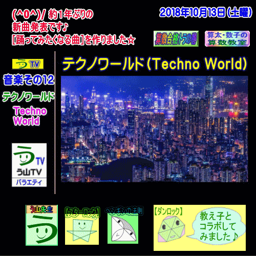 【作曲】[テクノワールド]【音楽その12】【う山TV(バラエティ)】[2018年10月7日] □──────────────────□ (*^ー^)ノ 【う山TV(スタディ)】と、 【う山TV(バラエティ)】で動画を配信致します☆ □──────────────────□ □ (o^-')b 「踊りたくなっちゃうような曲」を作曲しました♪ [ダンス・テクノポップな曲を作ってみた]です☆ □ ♪( ´θ`)ノ 【曲データ】 [曲名]テクノワールド [英語表記]TechnoWorld [時間]7分42秒 [テンポ]♪=135 [作曲日]2018年9月 [公開日]2018年10月7日(日) [作曲]う山雄一先生 [ギター]ケント [スペシャルサンクス] k-suke F-touch 1450 Prettyーk Other people □ 【音楽その12】[ダンス・テクノポップな曲を作ってみた] 【テクノワールド】(2018年10月7日) https://youtu.be/SN3iqa5R5Xw □ ♪( ´θ`)ノ 約1年ぶりの「作曲した曲の公開」です☆ テクノの曲調に、ラップをのせました♪ ケント君のギターは3分55秒からです☆ ケント君は、開成中高→東大、の教え子です。 数学とロックの鬼です♪ □ □──────────────────□ 【音楽】シリーズ 【う山TV(バラエティ)】 □──────────────────□ □ □ 【音楽その12】[ダンス・テクノポップな曲を作ってみた] 【テクノワールド】(2018年10月7日) https://youtu.be/SN3iqa5R5Xw □ □ 【音楽その11】[5曲詰め合わせ・♪=120] (30分・勉強用・仕事用・BGM) https://youtu.be/ROuD6NSVDOQ □ □ 【音楽その10】[スターダスト2]【う山TV(バラエティ)】 [2017年12月30日] https://youtu.be/SMbzffU6Hv0 □ □ 【音楽その9】[元気で楽しい曲を作ってみた] 【エネルギッシュ・ファン(Energisch Fun)】パート1:新宿 https://youtu.be/9ix53ViZhtE □ □ 【音楽その8】[心が落ち着く曲を作ってみた] 【コール・マイ・ネーム(Call My Name)】 https://youtu.be/qSEVzRMdJSY □ □ 【音楽その7】[頭の回転が速くなる曲を作ってみた] 【急いでそれをやらなくっちゃ!(I have to do it in a hurry. Yea!)】 https://youtu.be/VG1ZOuibbKk □ □ 【音楽その6】[α波が出る落ち着ける曲を作ってみた] 【ドリーミング(Dreaming)】 https://youtu.be/-9_h_-I84Wk □ □ 【音楽その5】[前向きになれる曲を作ってみた] 【テイク・ア・サンライズ(Take a Sunrise)】 https://youtu.be/oDbfhsblbr0 □ □ 【音楽その4】[楽しい曲を作って+楽しく踊ってみた] 【ファニー・ステップ(Funny Step)】パート1 https://youtu.be/dAKGPXGY4lk □ □ 【音楽その3】[集中力を高める音楽を創ってみた] 【Mysterious rhythm enhances concentration】 https://youtu.be/gVXunnle8RI □ □ 【音楽その2】[作業用音楽を創ってみた] 【Blue Sky and the Horizon】 https://youtu.be/tZMPNdburwk □ □ 【音楽その1】[やる気の出る曲・才能の育つ曲を作ってみた] 【Heartbeat the Ability Grows】 https://youtu.be/m2PU2znsGSk □ □ □ □──────────────────□ 算数・数学・家庭教師・個別指導・質問教室 □──────────────────□ □□□□□□□□□□□□□□□□□□□□ [氏名]【う山雄一】 [動画]【う山TV(スタディ)】 [動画]【う山TV(バラエティ)】 □ [メインサイト]【う山先生のHP】 https://uyama.theblog.me/ □ [中学受験・算数]メイン http://www.geocities.jp/sansu_gokaku_toranomaki/ □ [ブログ]【う山TV】 https://ameblo.jp/uyama-tv/ □ [動画配信]【う山TV】(スタディ/バラエティ) http://www.geocities.jp/sansu_gokaku_toranomaki/3-uyama-tv □ https://uyama-tv.themedia.jp/ □ □□□□□□□□□□□□□□□□□□□□ ☆ ☆ ☆ ☆ ☆ ☆ ☆ ☆